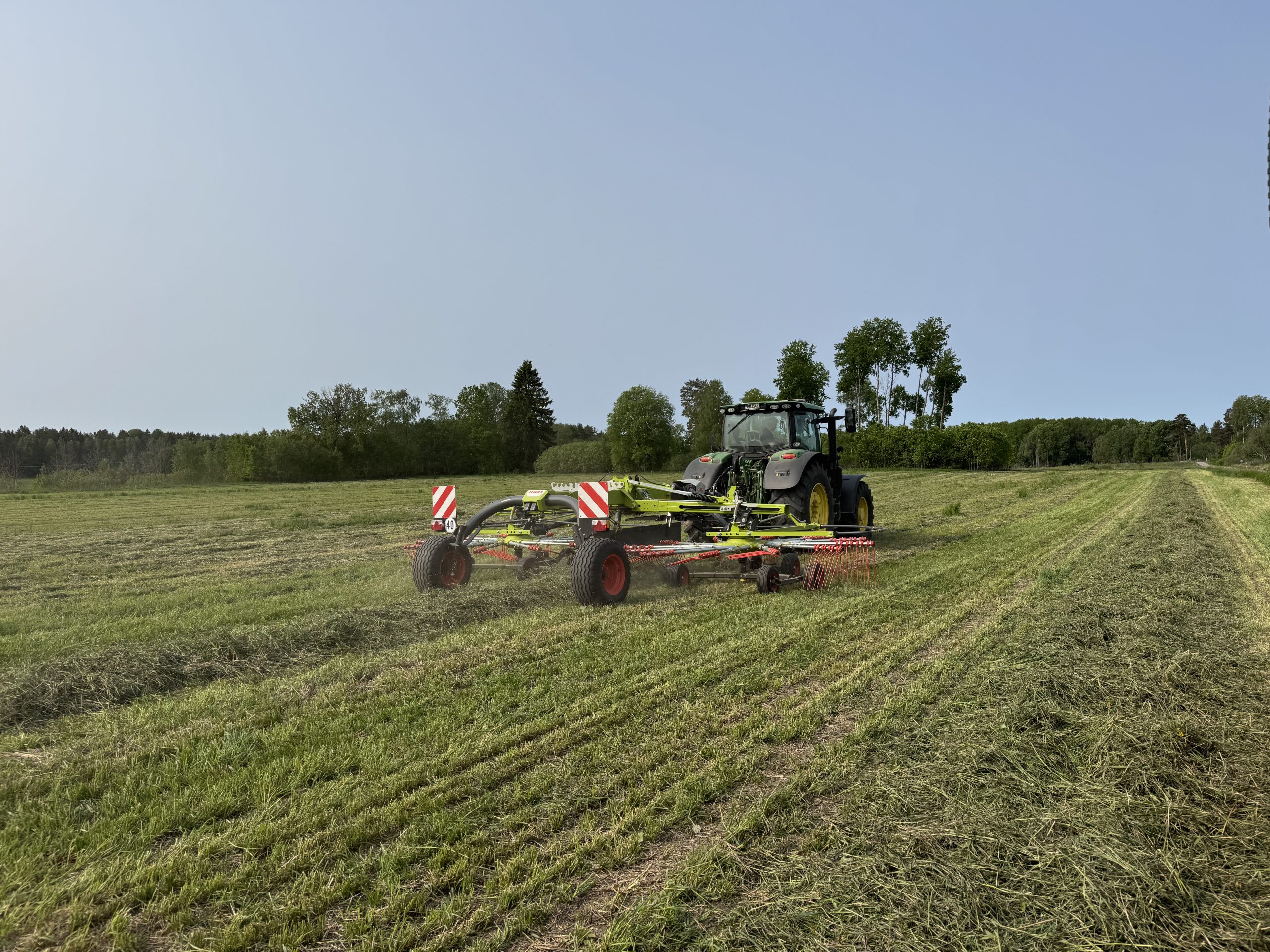 Yes, det är väldigt skönt nu att ha premiären avklarad, särskilt eftersom att det gick bra. Det är alltid lite nervöst när man drar igång grejorna i skarpt läge för första gången en säsong. Fast man vet att allt ställdes undan i fungerande skick och har provkörts, så vet man ändå inte riktigt om det fungerar förens man provar på riktigt. Nu är det i alla fall avklarat och först ut var en kund. Det var fint foder i bra mängd och allt gick bra, så det var en väldigt bra start på säsongen. Ska man gnälla lite så var det att det kom några droppar regn på de tre sista balarna innan de plastades, men det ska man kanske inte gnälla på. Istället kan man vara nöjd över att det var bra tajming, eftersom att himlen straxt efter att plastaren lämnat sista fälten öppnade sig ganska så bra. Full fart på vindrutetorkarna fick jag ha när jag åkte därifrån. Så nu är de första 400 balarna för säsongen avklarade, får se hur många fler det blir….