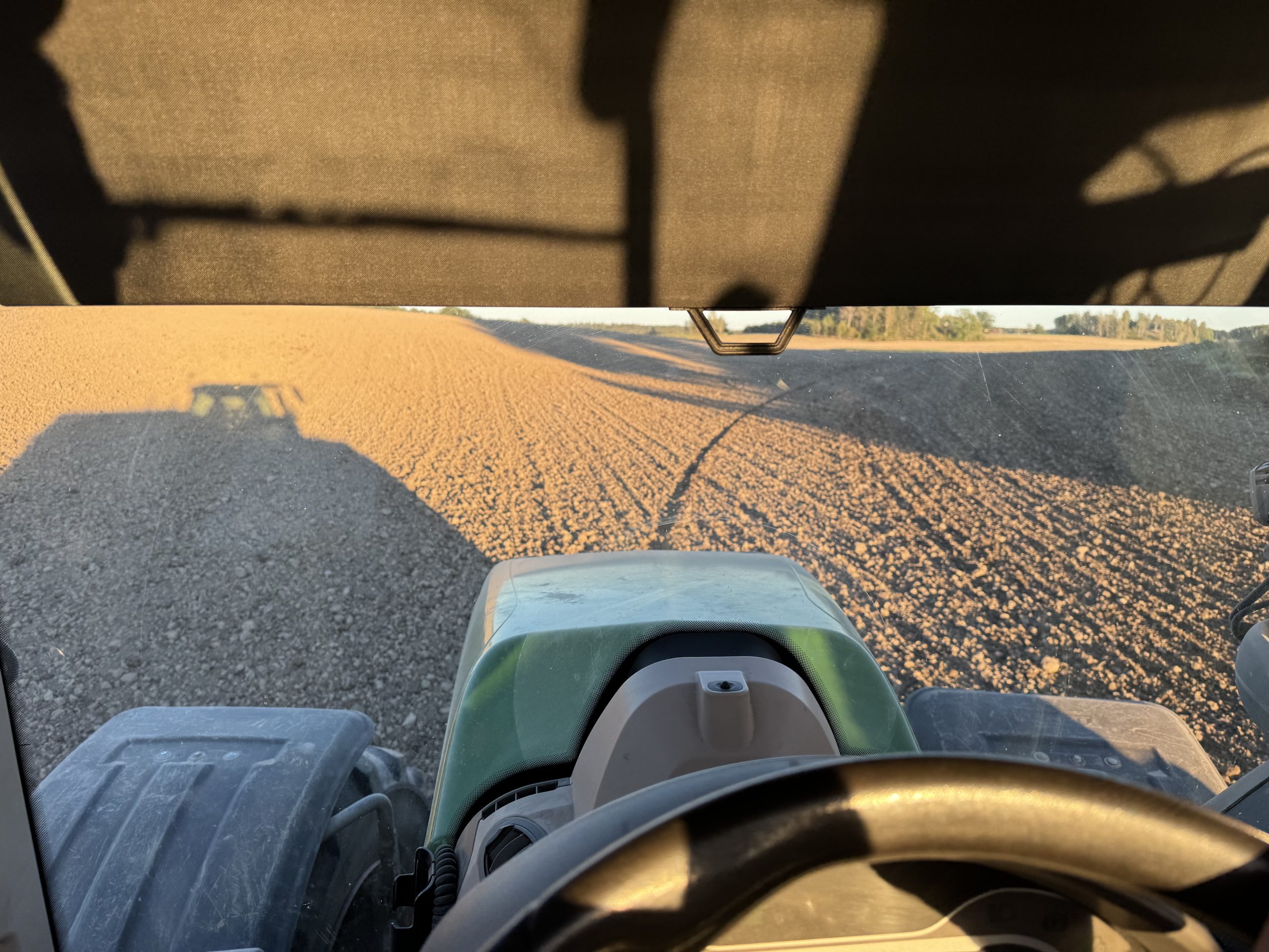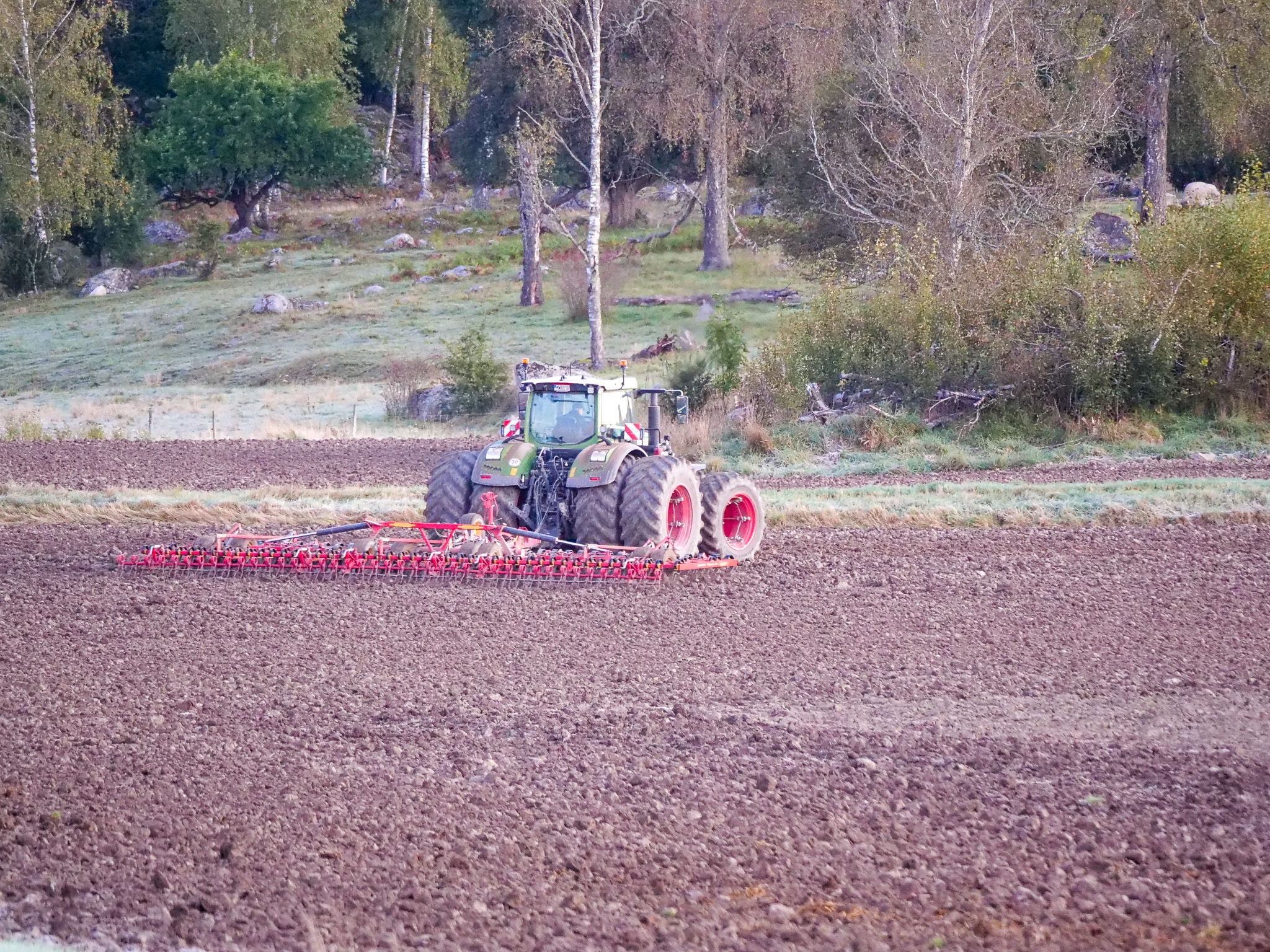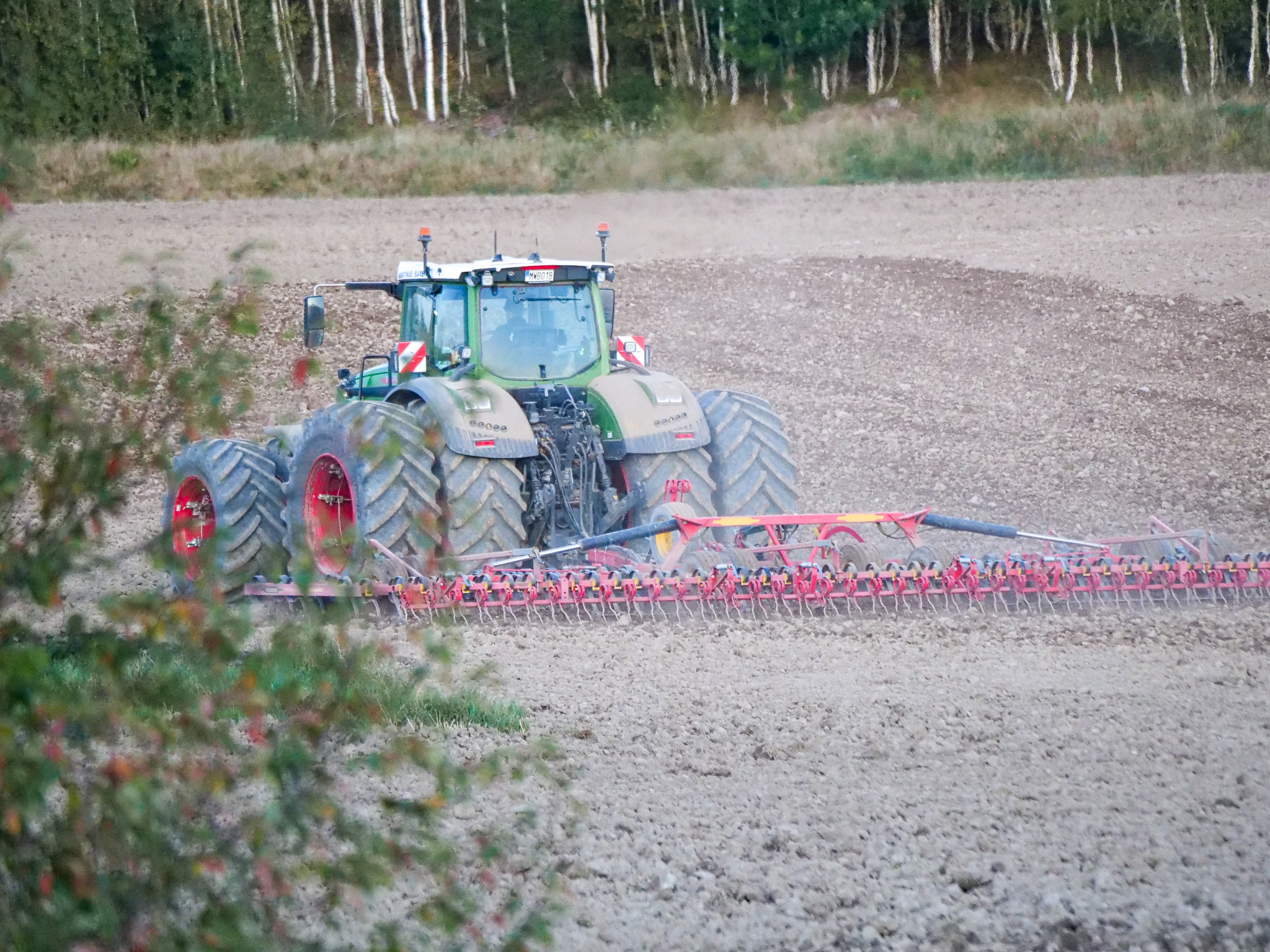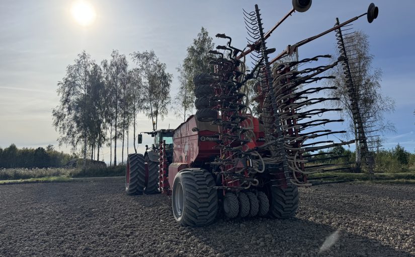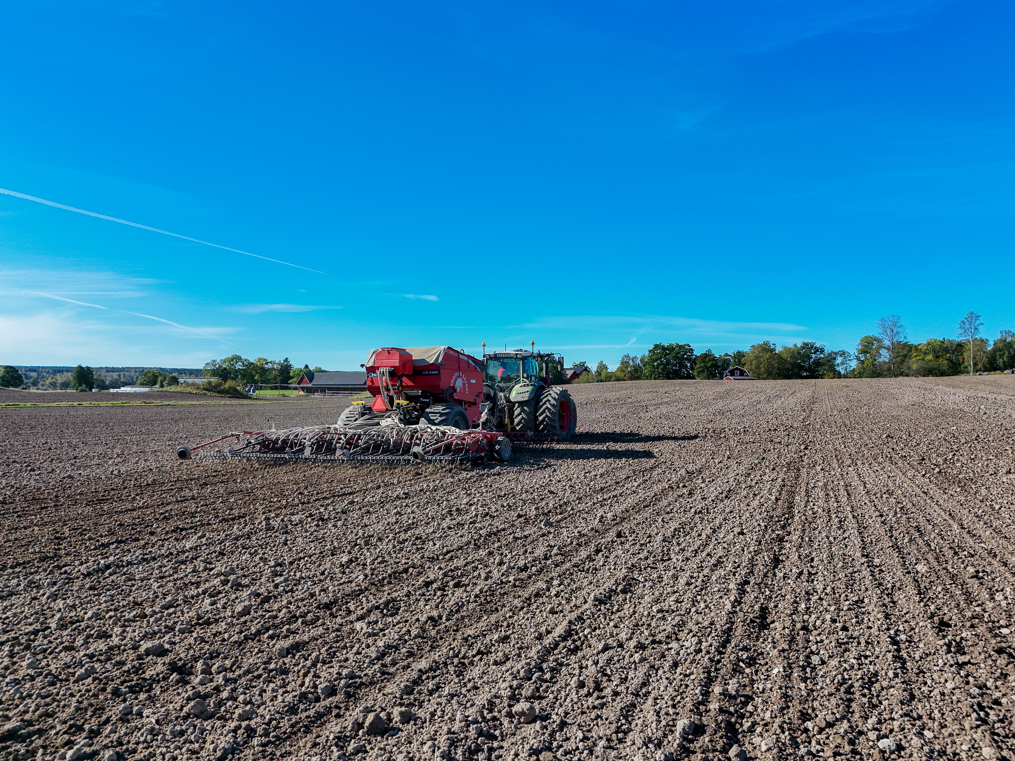 Vi jobbar nu på för att hålla våran plan vad gäller höstsådden och det ser just nu verkligen ut som att vi kommer att lyckas. Kanonväder gör att det torkar bra i marken och tack vare det har vi nu lyckats så ytterligare 90 hektar. Det gör att vi nu endast har 90 hektar kvar att så innan vi är klara och om inget konstig händer så borde det vara klart på lördag. Vi sår nu sorten Kask i utsädesmängden 480 grobara frön per kvadratmeter vilket innebär 213 kg vara per hektar av det parti vi sår nu. Med i såmaskin är också MAP 11-23 som körs ut med styrfil efter markkarteringen. Ungefär så ser det ut och jag är lite sliten så innan jag börjar vimsa runt med orden här så avrundar jag med lite bilder..