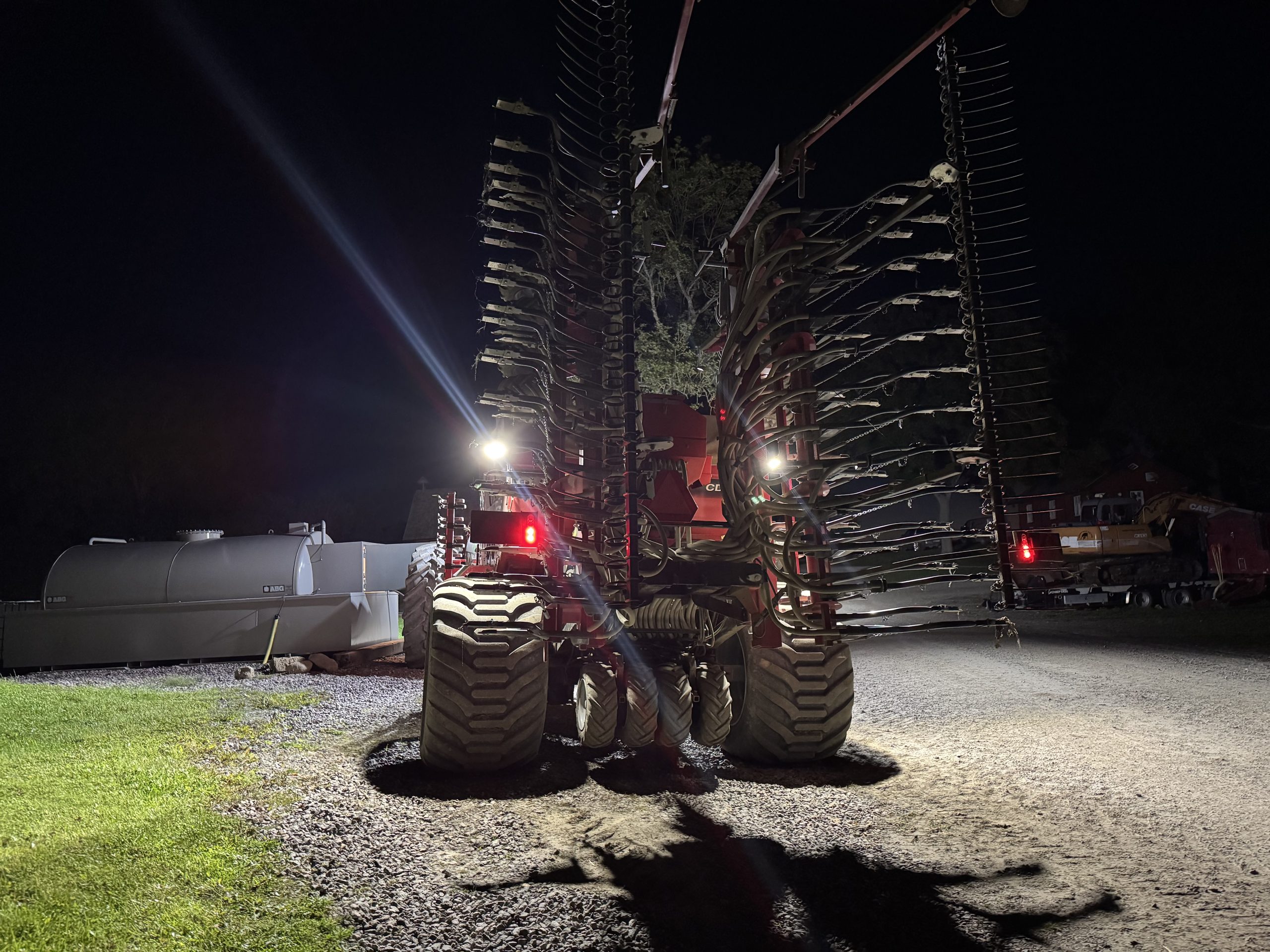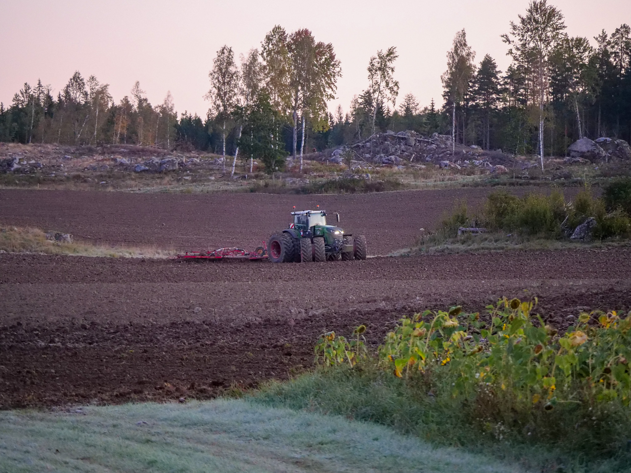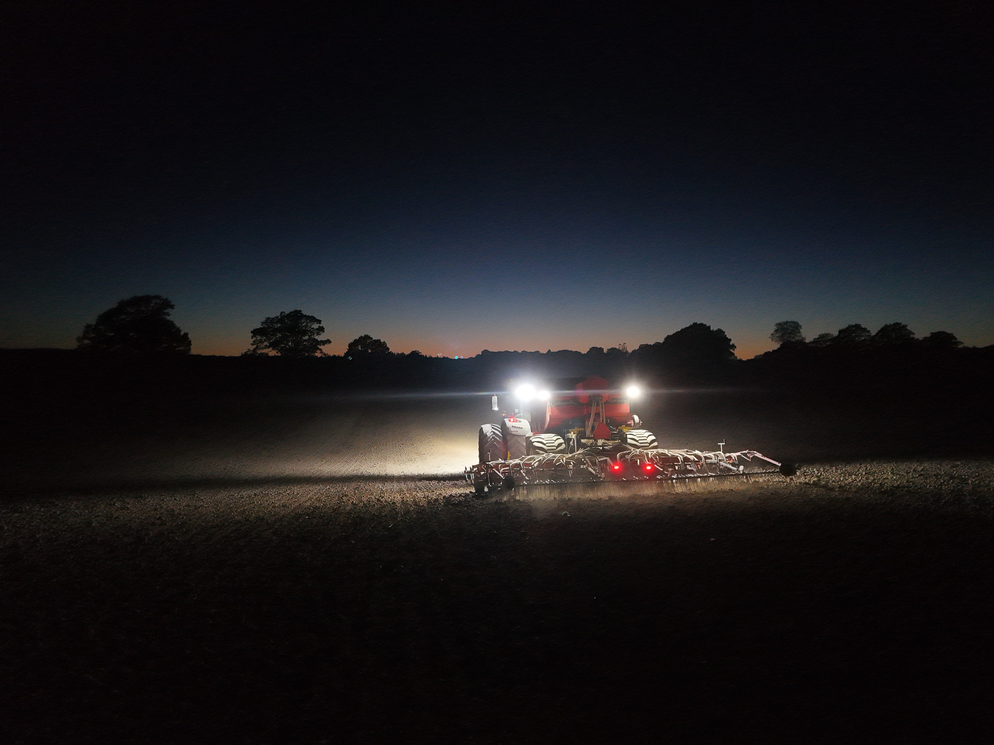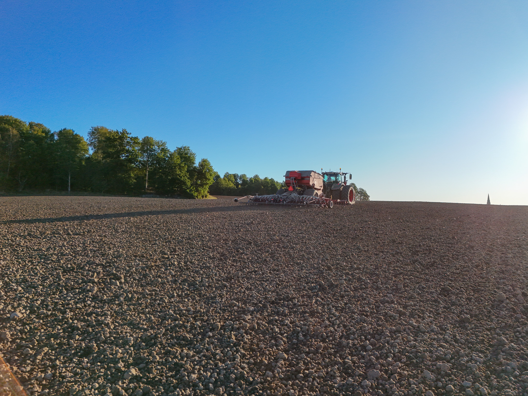 Vi jobbar nu på för att hålla våran plan vad gäller höstsådden och det ser just nu verkligen ut som att vi kommer att lyckas. Kanonväder gör att det torkar bra i marken och tack vare det har vi nu lyckats så ytterligare 90 hektar. Det gör att vi nu endast har 90 hektar kvar att så innan vi är klara och om inget konstig händer så borde det vara klart på lördag. Vi sår nu sorten Kask i utsädesmängden 480 grobara frön per kvadratmeter vilket innebär 213 kg vara per hektar av det parti vi sår nu. Med i såmaskin är också MAP 11-23 som körs ut med styrfil efter markkarteringen. Ungefär så ser det ut och jag är lite sliten så innan jag börjar vimsa runt med orden här så avrundar jag med lite bilder..