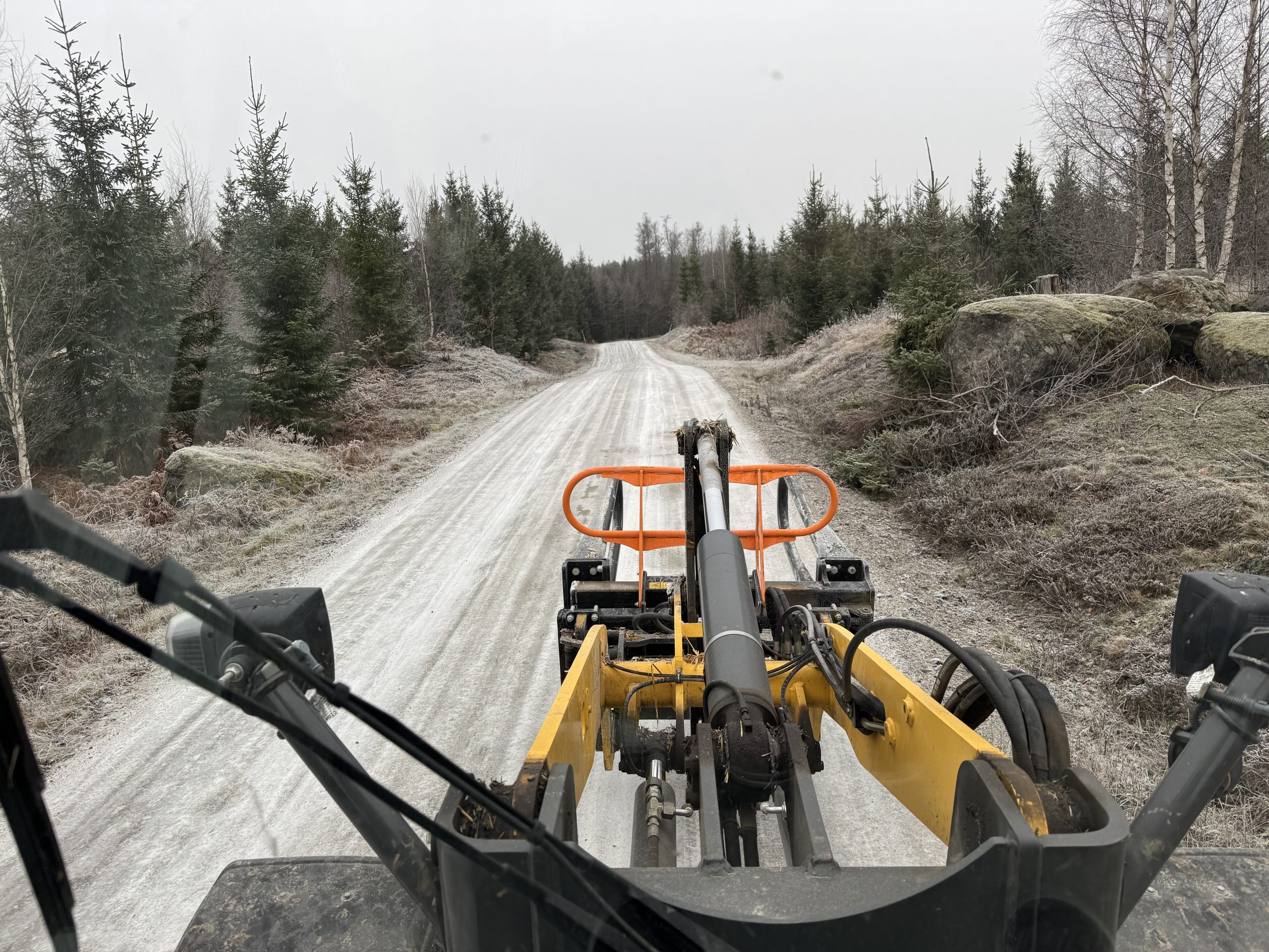 Vi är ju som sagt var lite beroende på att det går att åka på fälten med hjälp av minusgrader, synd bara att minusgrader kan innebära att väglaget kan vara halt.  Så var det idag, förhållandena på fälten var kanon. Bärigheten var mycket bättre än vad jag vågat räkna med när vi idag gjorde ett första försök. Inte ett spår på djupet blev det av lastmaskinen. Även om vi inte vågade lämna vägen med släpet. Däremot så var vägen jättehal på många håll, till och med så hal så att vi inte ville åka med full släp på den. Därför så blev det inga balar hemkörda, säkerheten för oss och andra går ändå i första hand. Vi lastade därför endast släpet och ställde kvar det i väntan på bättre väglag. Lite surt ändå att vi inte kan få hem fodret på grund av väglaget, den som har hand om vägen kan ju faktiskt sanda den…. Så kanonförutsättningar på fälten, men katastrofförutsättningar på vägen var det alltså idag och inga balar fick därför följa med hem…