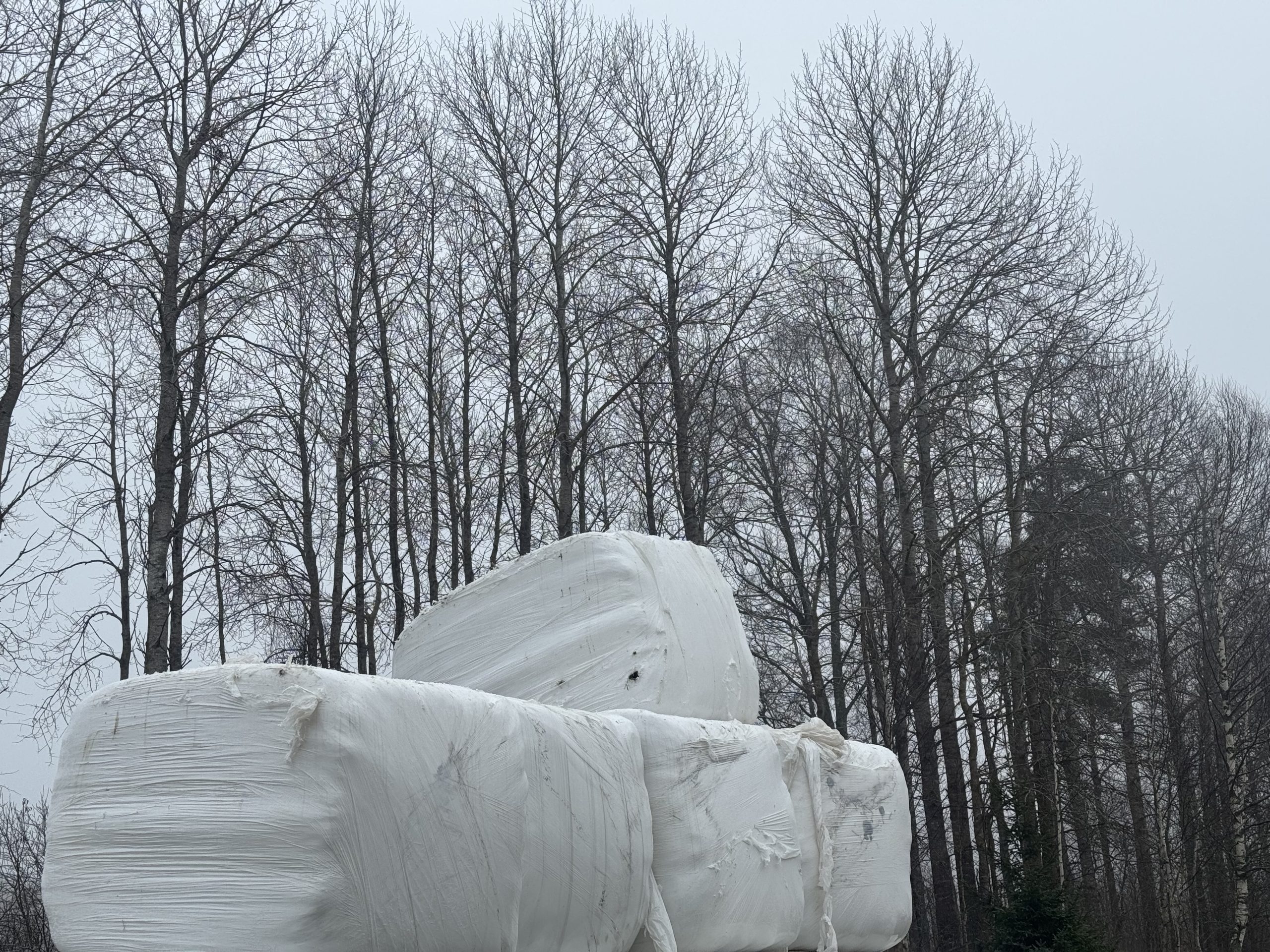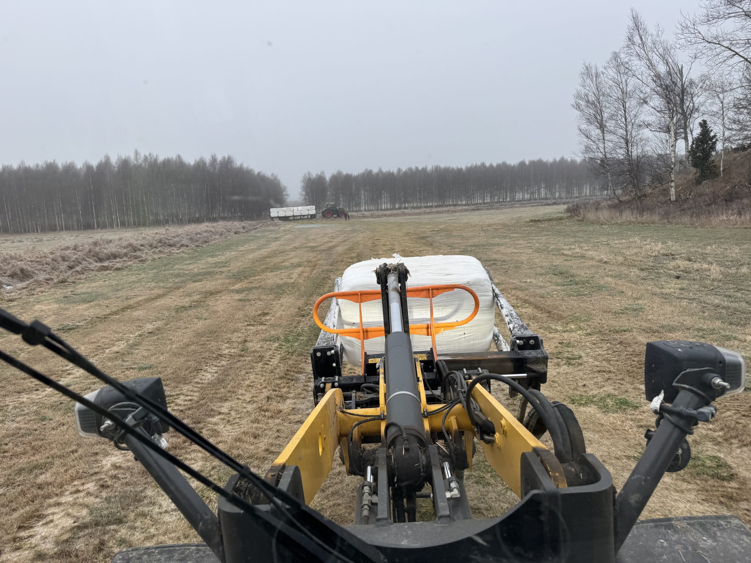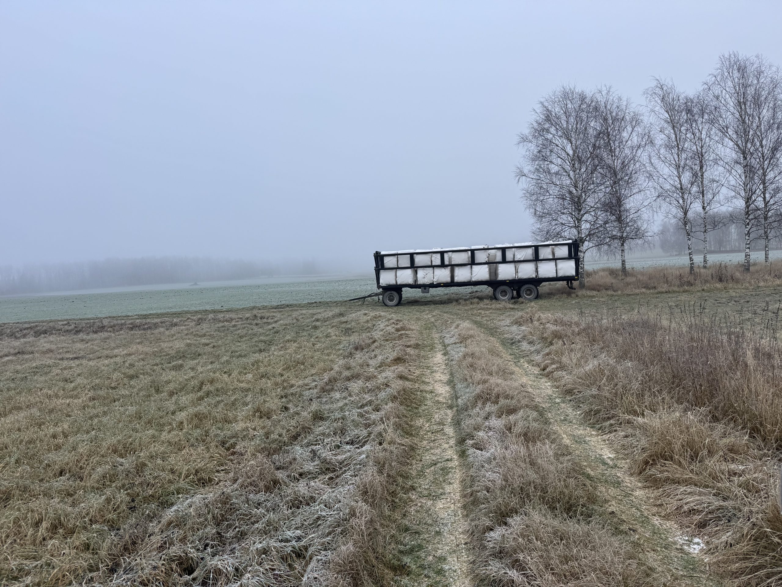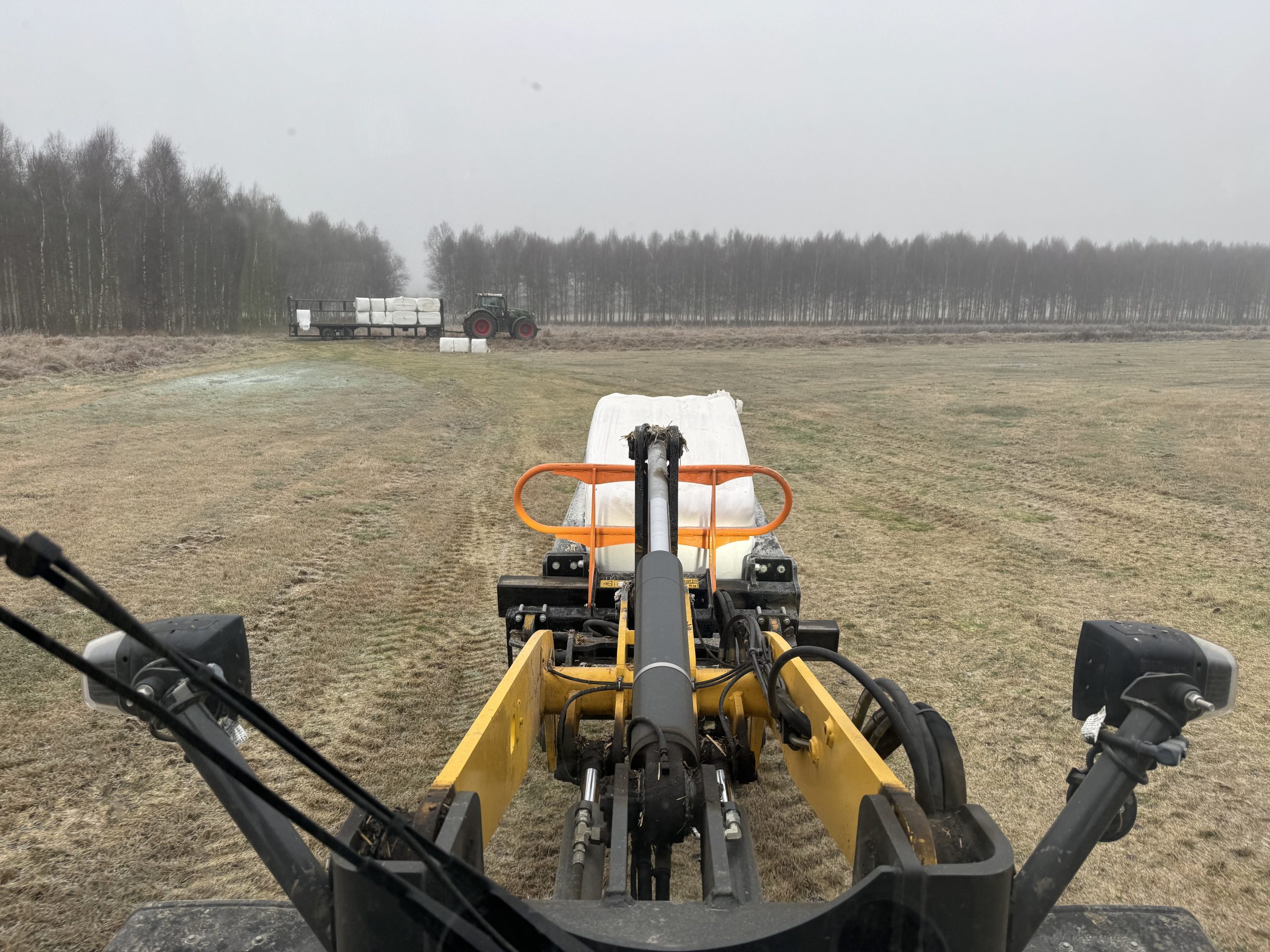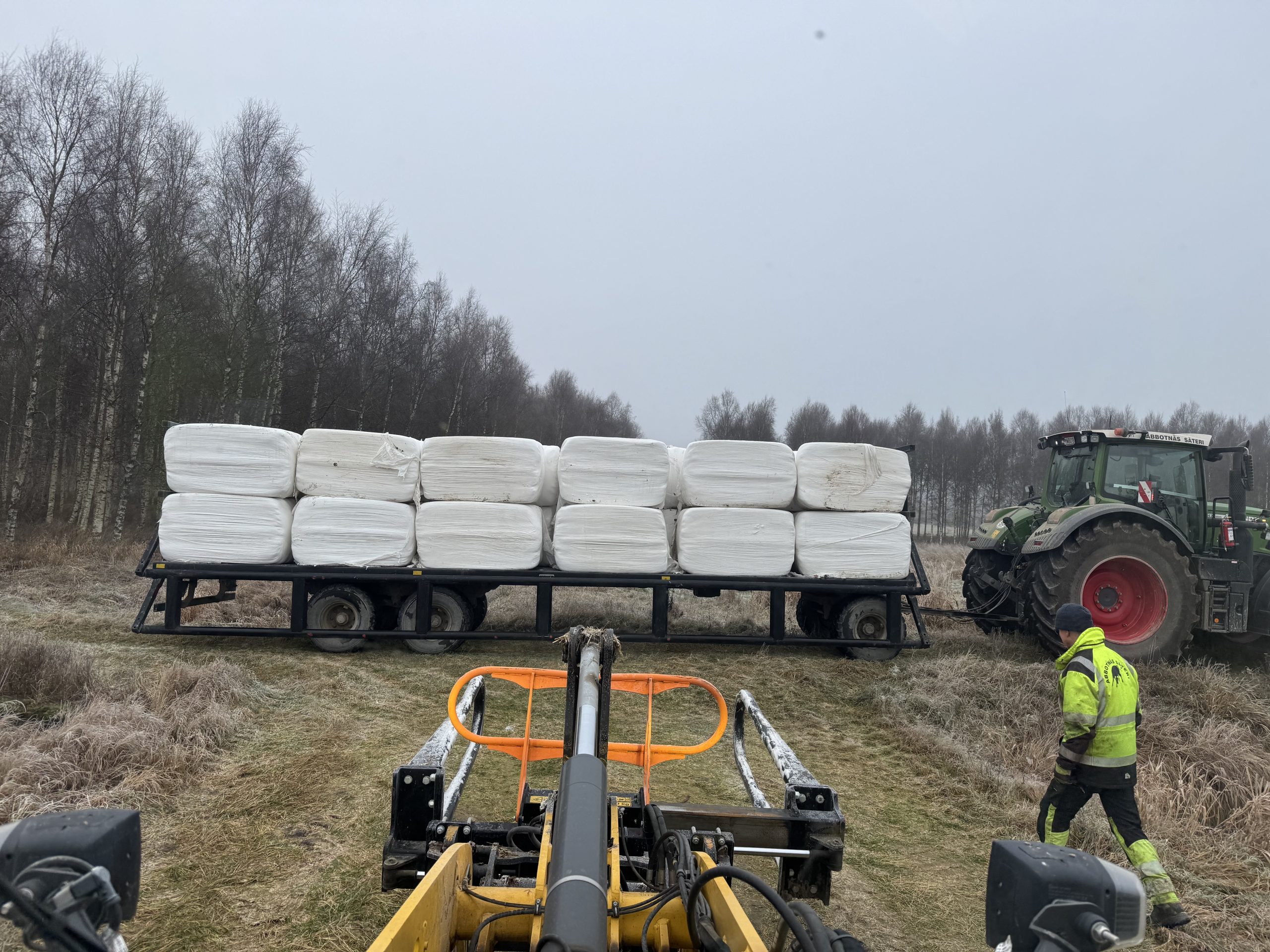 Det sista egna fodret vi brukar ta på året är det på våra mulljordar. Det är bra foder för våra dikor att äta nu på hösten när de precis kommit in och inte behöver så mycket energi. Dock så kan skördandet av detta bli spännande eftersom att bärigheten kan vara sisådär. Eftersom att själva skördandet blir spännande, så blir ihopkörningen av balarna ännu mera spännande. Det går sällan att utnyttja släpet utan man får bära balarna kors och tvärs med lastaren. Vi brukar lägga balar i fältkant och vänta på kallare grader som gör att vi kan åka på fälten. Ibland går det bra med släp och ibland inte. I höstas när vi skördade var det nätt och jämt att det gick att lyfta ihop dem med lastare. Så detta brukar helt klart vara en av hösten huvudvärkar. Nu i år satte vi lite extra press på oss själva genom att bestämma att detta skulle fodras upp innan jul och la därför lite mindre plast på balarna. Till historien hör nämligen också att det finns väldigt gott om sork och fågel som ger sig på balarna.