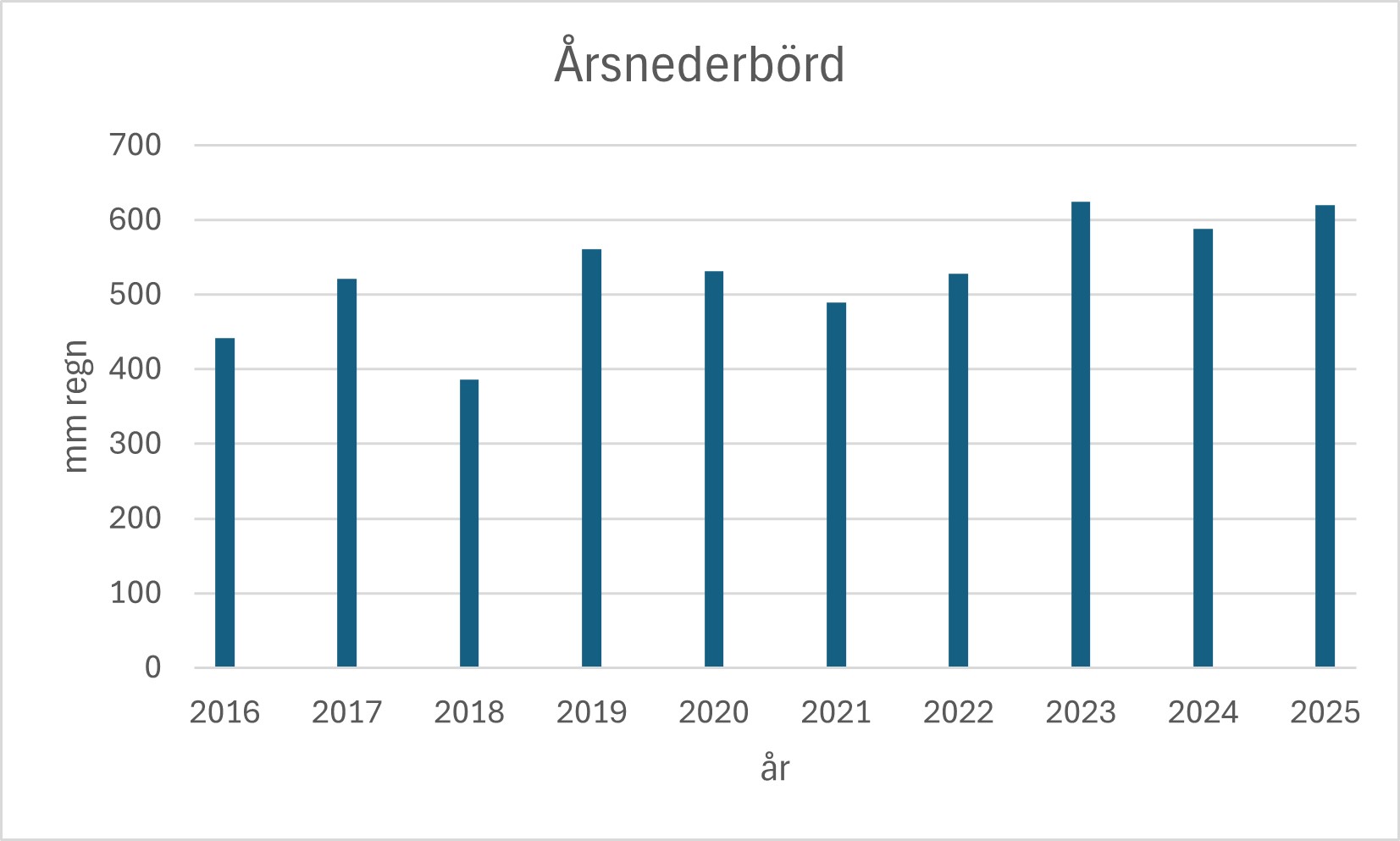 Just nu känns det inte som att det gör så mycket mer än att regna och det blir snabbt blötare. Så kan det vara, men nu är det färdig gnällt för detta inlägg. Nu kollar vi istället på lite statistik över årsnederbörd i vårat område, här kommer några diagram jag har satt ihop. Källan på detta är SMHI´s open data från en väderstation som ligger några km härifrån, förutom på 2025 då är en av våra väderstationer källa.
