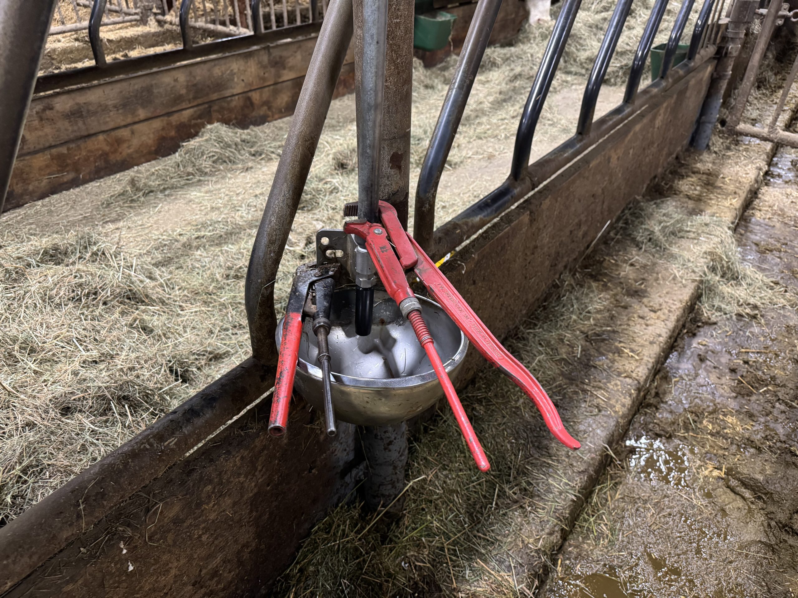 Ett exempel från dagen på extarbete utav den lättare varianten var en vattenkopp som frös sönder. Vi har värmeslinga ligger i våra vattenledningar som ser till att de inte fryser och det fungerar kanon, särskilt i kombination med isolerade ledningar där det går… I de allra flesta fall resulterar detta i att det endast är vattennipplarna som fryser fast när djuren inte druckit på ett tag och behöver därför tinas. Det gör vi med varmvatten. Däremot så när nipplarna varit frusna en liten längre stund eller om det varit lite kallare, så kan sista delen av röret också frysa. Kallgraderna vinner över värmen som värmeslingan skapar. När vatten fryser så expanderar det som bekant och då kan det innebära att saker spricker. Det hände idag på eftermiddagen, övergången från rör till vattenkopp hade spruckit. Det är inte helt ovanligt att detta händer och det var bara att byta den lite snabbt. Det är i de flesta fall en snabb operation på cirka 20 minuter för att byta den som är trasigt, men kan ibland dra ut på tiden på grund av diverse strul. Det som däremot kan dra ut på tiden är om stora mängder vatten hunnit rinna ut och fylla skrapgången, då tar det lite längre tid. Så var det inte idag som tur var… Så trotts detta gillar jag minusgrader, fördelarna väger helt klart upp nackdelarna.