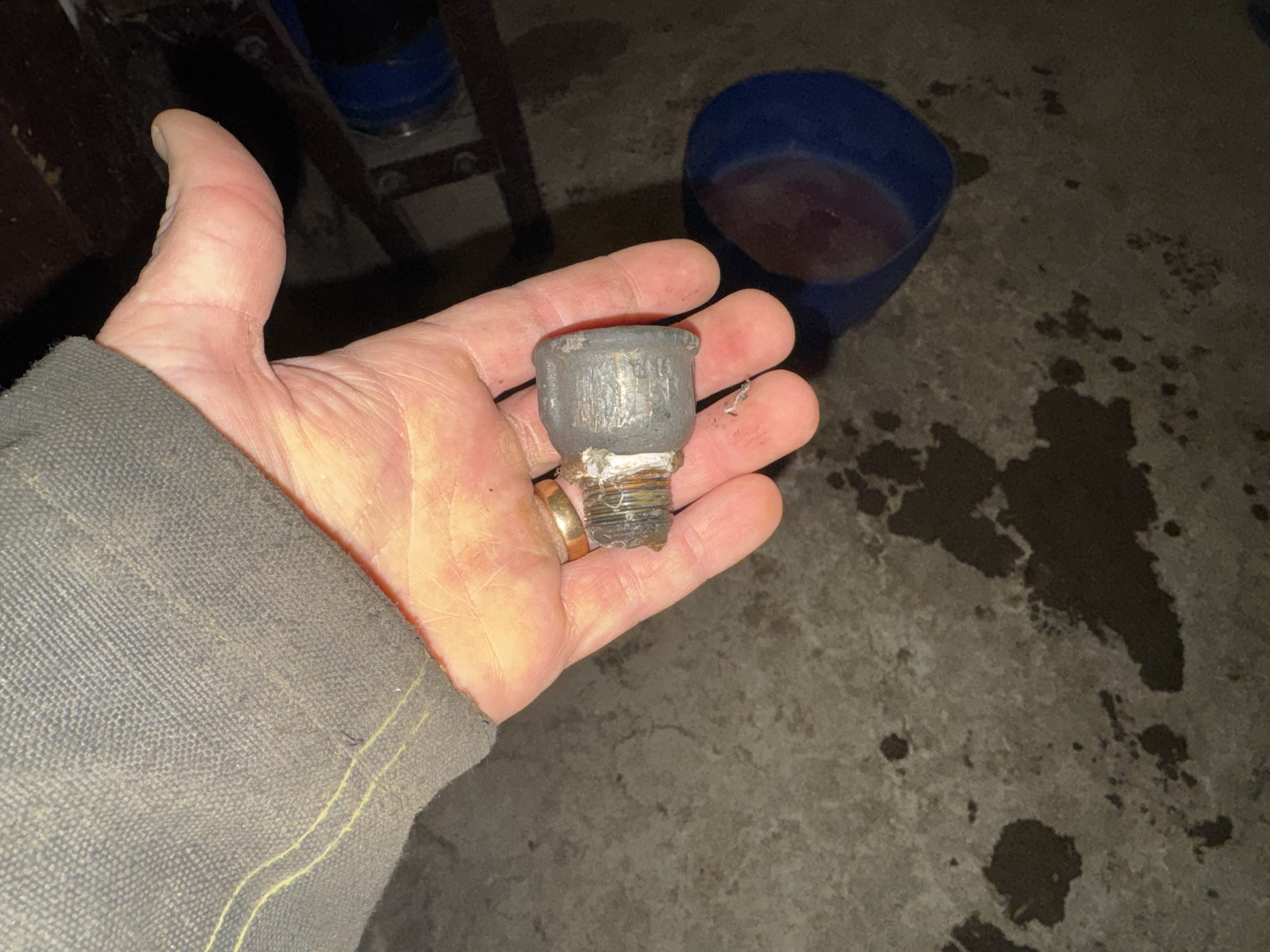 Här är den trasiga delen. En lite spricka som kan ha kommit från att avelstjurarna varit elaka mot vattenkoppen, men i såna fall nar de nog det för att nippeln var frusen just när en av dem skulle dricka. Så det var ändå tack vare minusgraderna.