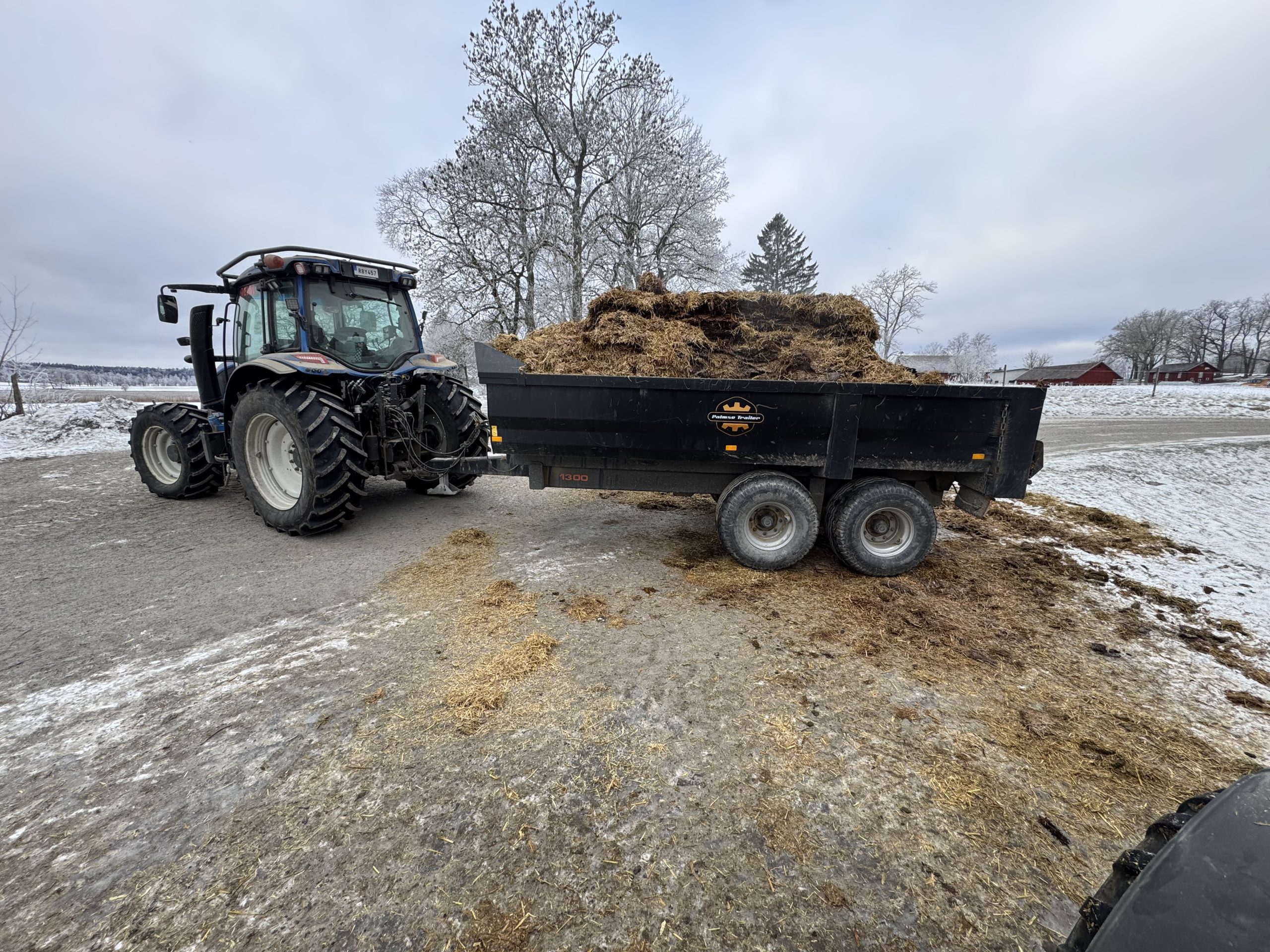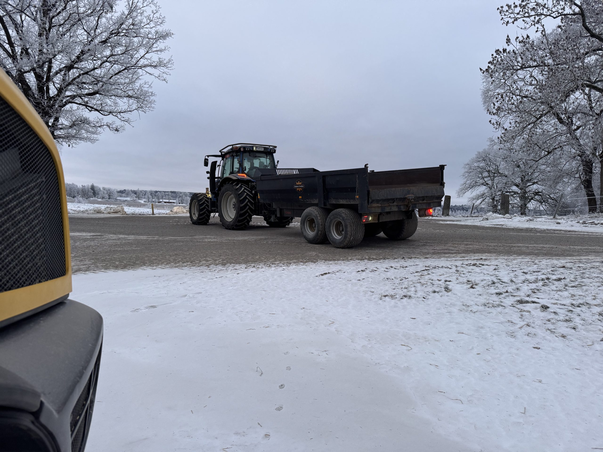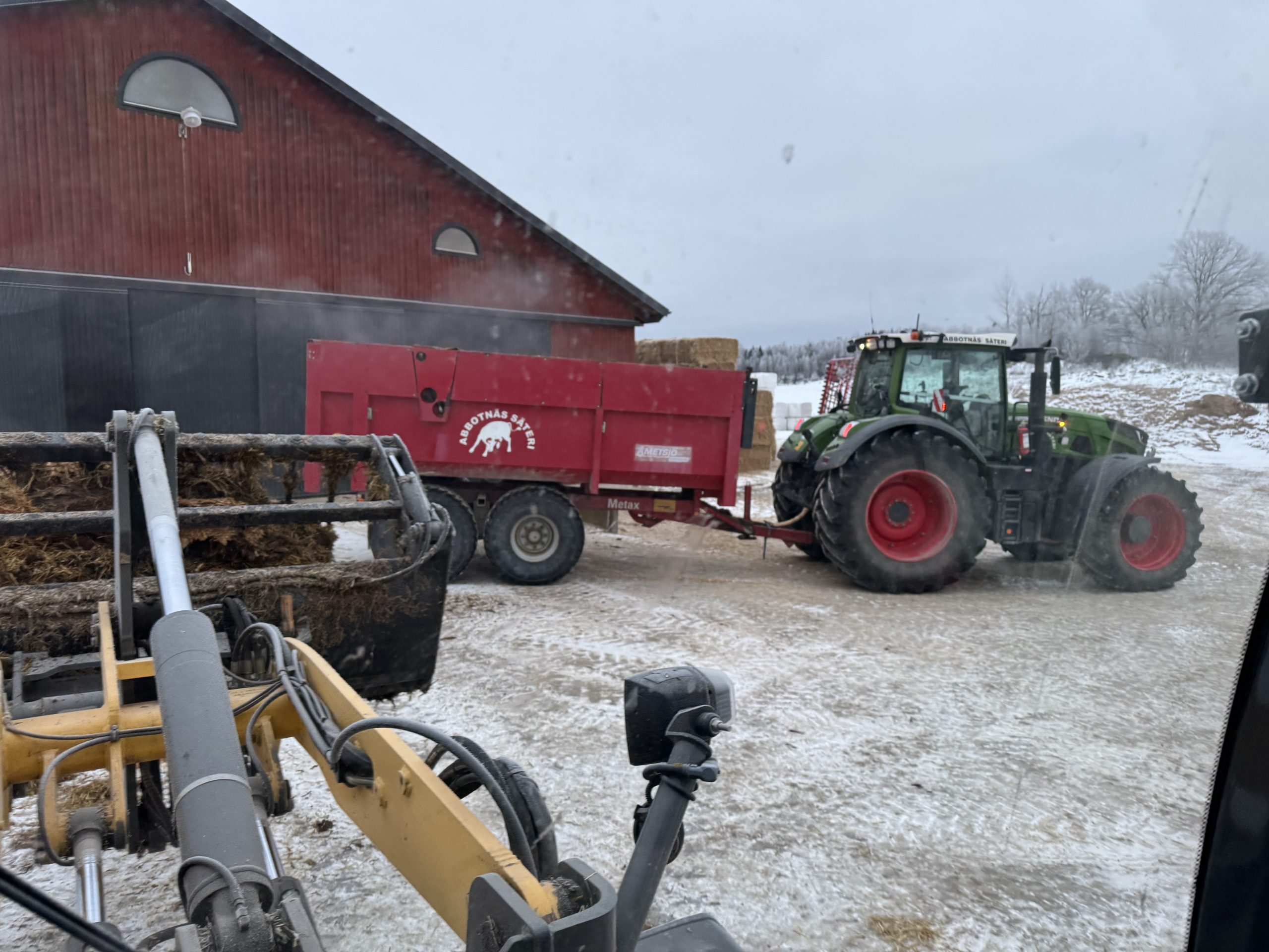Detta arbetsmoment är ett moment som vi börjar få till ganska så bra efter många års förbättring och effektivisering. Både genom uppdateringar i maskinparken och planeringsförbättringar. Den här gången så blev det dock något steg bakåt i effektivisering i maskinparken, men det kompenserade vi för i planeringen och då tappade vi inte effektiviteten märkbart. Tur när det går att parera ändringar på ett bra sätt tycker jag. Det som är ändringen är att en utav kärrorna (den kärra som vi kallar stora) vi har när vi gör detta står lite på verkstad nu och väntar på packningssats till tippkolven, men vi kan inte vänta med att gödsla ut tills den är klar så vi fick helt enkelt anpassa oss lite efter det vi hade. Det resulterade i att istället för en 18 m3 och en 27 m3 så ersattes den på 27 m3 med en på cirka 10 m3 kanske, helt klart skillnad. Som tur var så gick det som sagt vara att lösa effektiviteten ändå, vi fick bara inte köra iväg så lång med lassen. När vi gödslar ut så gäller det att lastmaskinen ska få ut så många grepar som möjligt i timmen, det är där kapaciteten sitter, och så länge den har någonstans att tippa så sinkas inte processen. Så med facit i hand så måste jag erkänna att jag är förvånad över att det inte tog längre tid. Ändringen blev dock att den som körde kärrorna inte hade lika mycket tid att hjälpa till inne i lagården, så det gick åt lite extra arbetskraft där idag. I ”vanliga” fall brukar det räcka med två personer som gödslar ut, men idag var vi 2,5-3 personer.