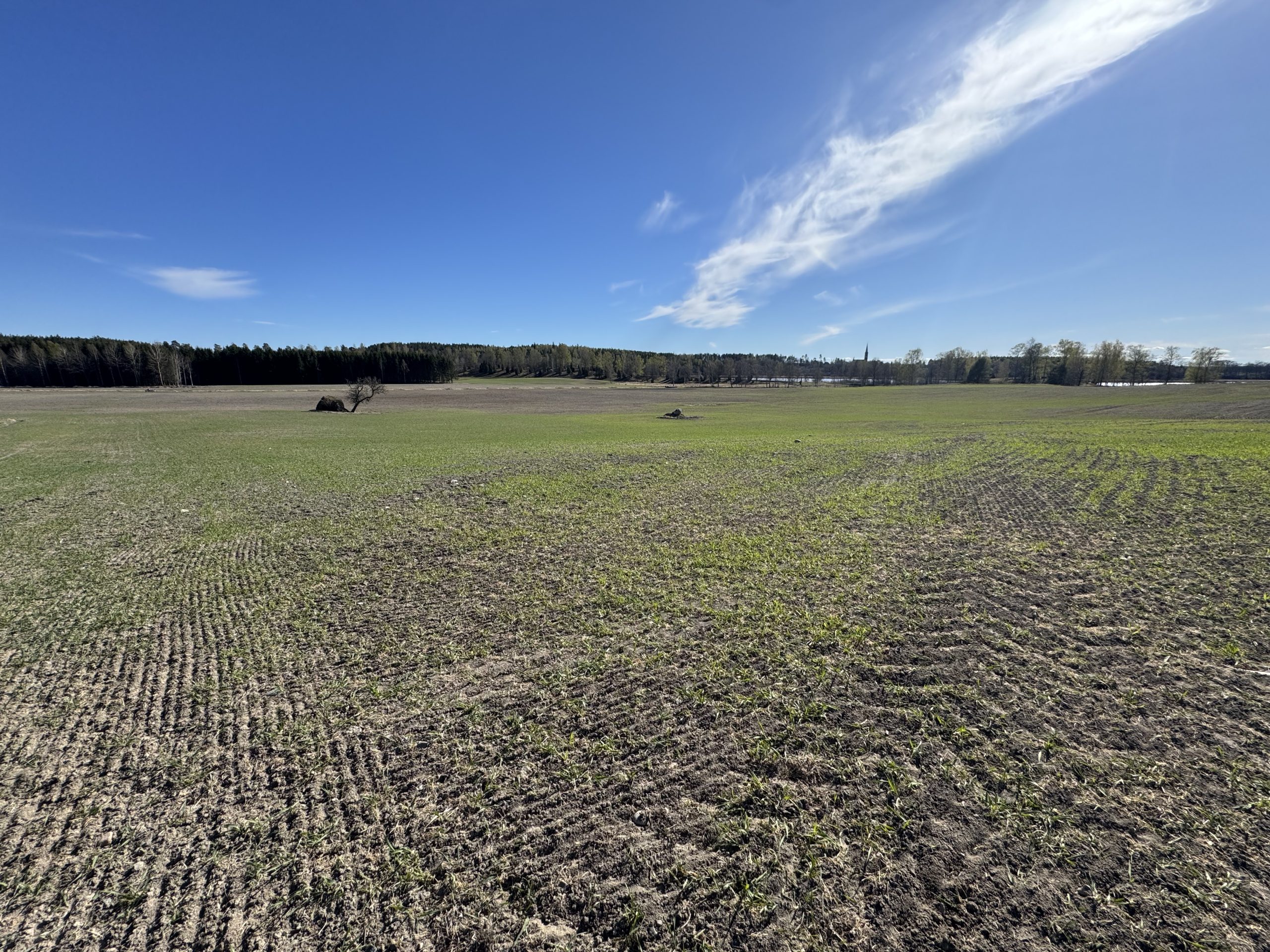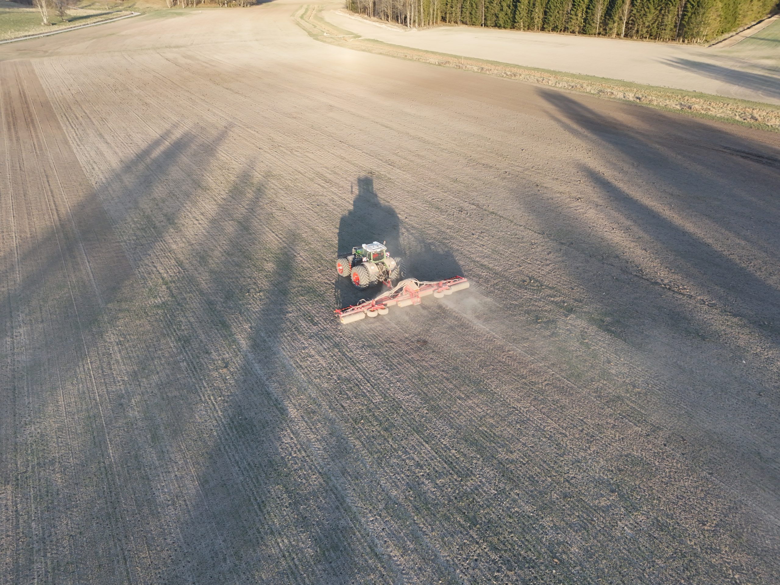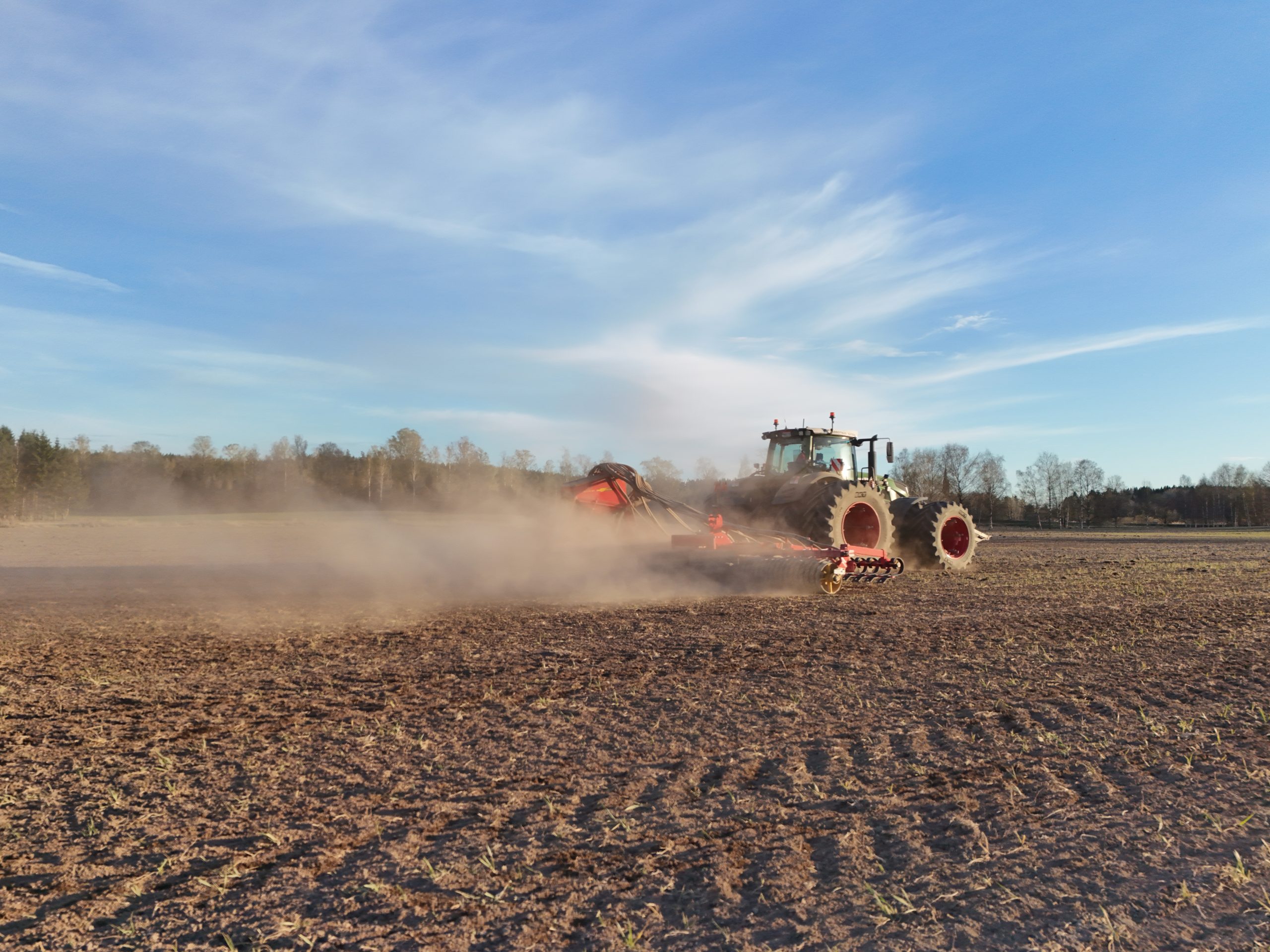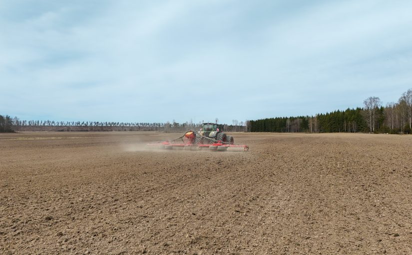 Det är ju det här med beslut, ibland är de svåra och ibland är de enkla. Just i det här fallet var det ett ganska så enkelt beslut. Jag ska kanske inte säga att det var en chansning att så den här marken med vete i höstas, men vi var medvetna om risken. Även om den här vintern kanske inte ska klassas som en representativ vinter så inser vi att risken med höstsäd här är för stor. En stor del frös upp på den låga mullen och resten har inte heller mått bra. Med dem förutsättningarna ihop med marknadsläget så blev beslutet ändå ganska så enkelt. Vi försöker få till ny vall här och det gör vi genom att så in i höstvetet. Vad vi sedan gör med höstvetet i år får vi se, men just nu känns helsäd som ett bra alternativ. Än så länge är det inte gödslat mer än i höstas, men kommer det bara regn som är förutsättningen för att det här ska bli något vete överhuvudtaget så kommer det nog komma loss lite kväve från marken. Nu har vi i alla fall sått timotej och ängssvingel här och hoppas att det blir en bra vall. Det kommer passa bra med vall på dessa mulljordar.