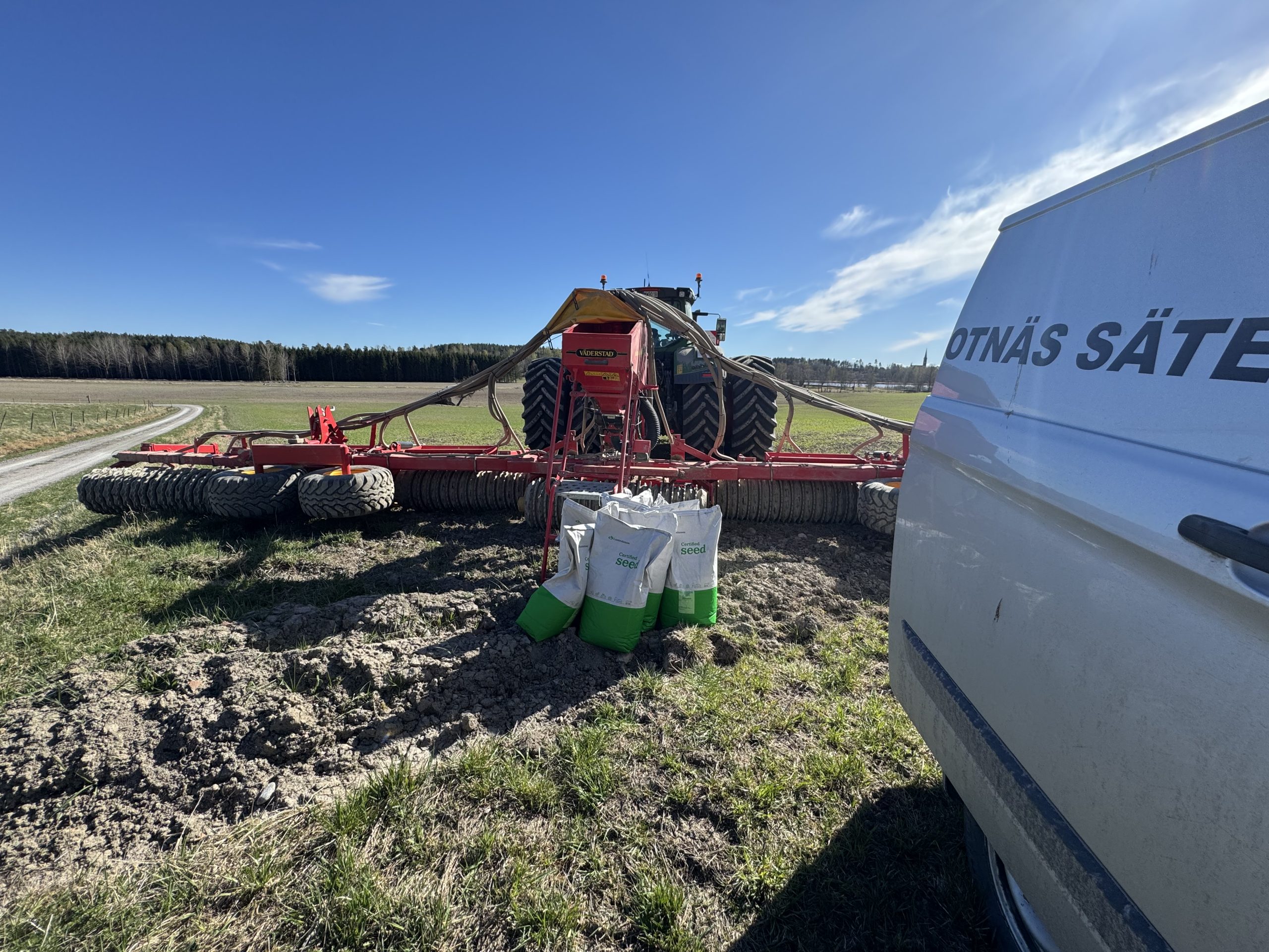 Vårens utmaningar fortsätter, men nu kan vi lägga några bakom oss. Något som jag inte nämnt här så mycket är det vete vi sådde på gammal vall som vi bröt i höstas. Nu har vi hursomhelst bytt huvudgröda där och har sått in gräsfrö där, det blev klart nu ikväll.