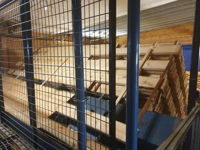 Efter ytterligare en sågning så kommer bräderna och planken in för upplägg innan torkning. Här stoppade Mikael och Gunnar linan så vi kunde se hur ”våra” stockar blev som bräder och plank. Mycket intressant! Med hjälp av färgen på ändytorna kunde vi spåra bräderna/planken till respektive stock och de fina stockarna gav också det finaste slutmaterialet.