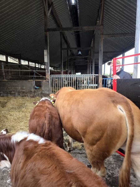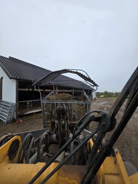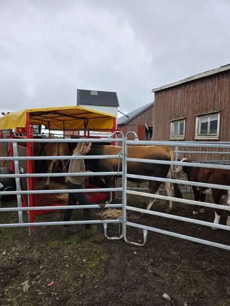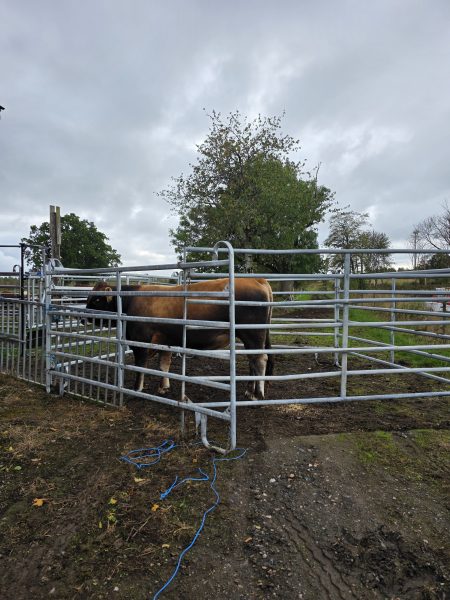 När vi hade släppt ut alla tjurar igen och går ut från ladugården står tjurkalven utanför. Ååhhhhhhh! Bara att börja om. In med honom till sin mamma igen. Han hade hoppat ut igenom foderbordet. Vi satte spännband sen för att minska på hålen.