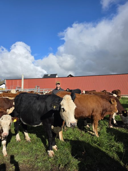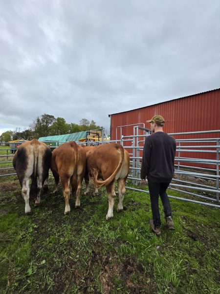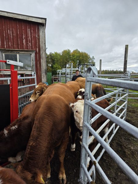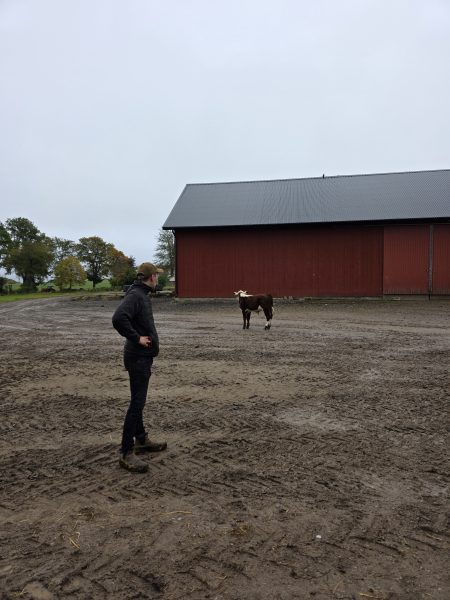 Alla utegångsdjur är nu på plats inne. Just det, sen var det ju tjurkalven som rymde. Efter vi lastat av de sista tre kvigorna som rymde till kossorna igen så lastade vi på tjurkalven när ändå djurkärran var där. Då slapp vi stänga upp alla djur i ladugården igen.