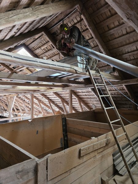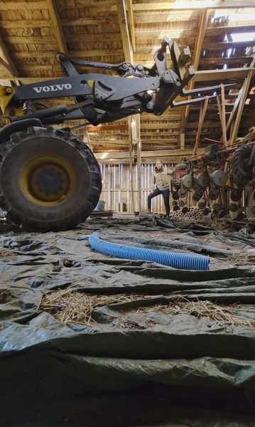 Jag kommer förbi med fyrhjulingen och ser John springer! Han springer verkligen inte i onödan. Men jag åkte vidare och stannade vid ladugården. Då såg jag det rök från torken.