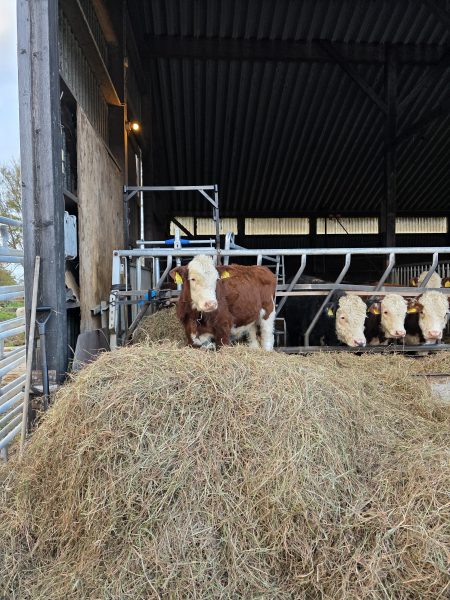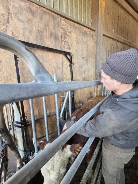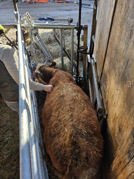 I torsdags märkte vi att det inte riktigt var som de skulle med en av tjurkalvarna. Vi ringde veterinär direkt för att rådfråga och hon trodde det kunde vara akut våmacidos. Vi kunde starta behandling själva. Men sen i fredags fick tjuren rejält med diarré, så vi ringde veterinär igen som tidigast kunde komma fredag kväll. John fick lämna kalasandet och det sattes in medicinering på tjuren.