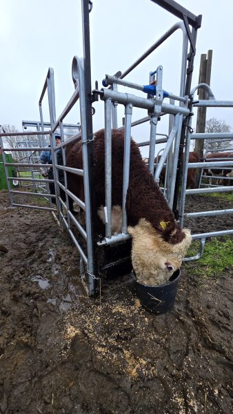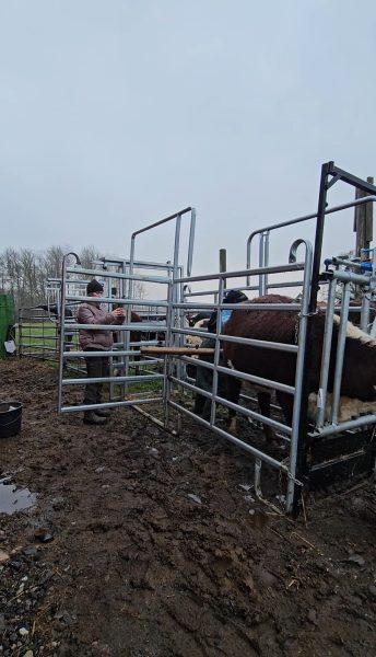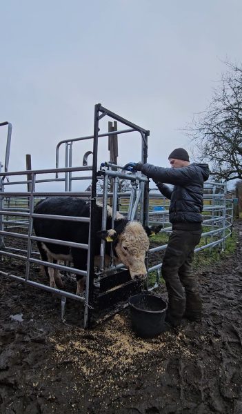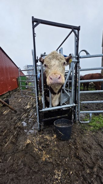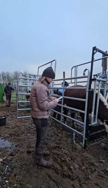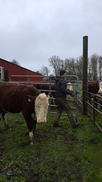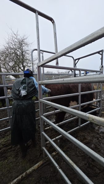 John drev på kossorna inne i fållan till drivgången. Jag skötte anteckningar och släppa ut kossorna efter undersökning. Sen hinna med och fota mellan svängarna.