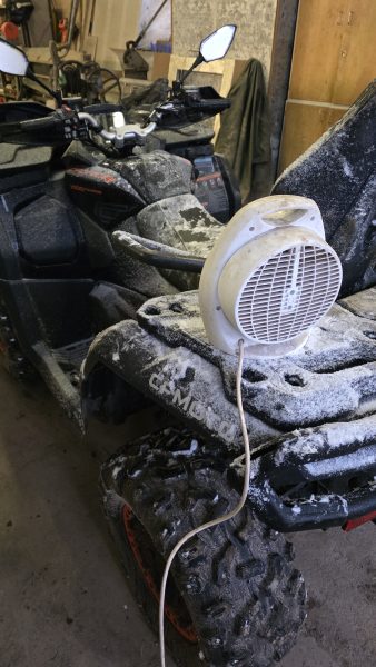 Men det går ju lite troll i det hela, för när jag och Irma skulle dra till kossorna så startade inte fyrhjulingen heller. Vi puttade den till lastmaskinen för att kolla batteriet, men de var bra.