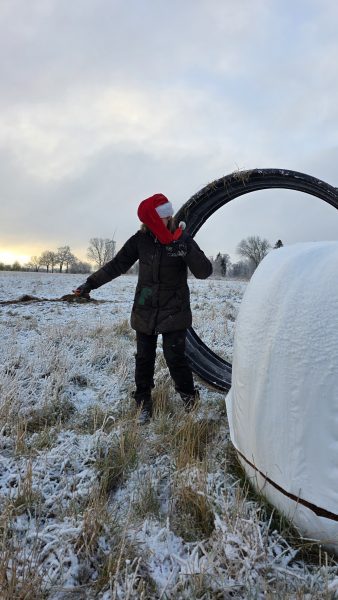 Dom var långt bort i hagen, så Irma fick hjälpa mig att öppna balar.