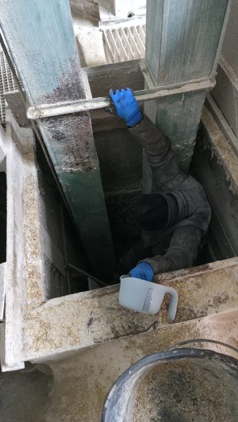 Sen var det egentligen dags att krossa spannmål. Men i elevatorgropen stod det typ 1,5 m högt vatten. Så det var ju inte så enkelt. Vi förde ner en dränkbar pump och pumpade ut massa vatten. Sen i slutet blev det hinkar och dammsugare.