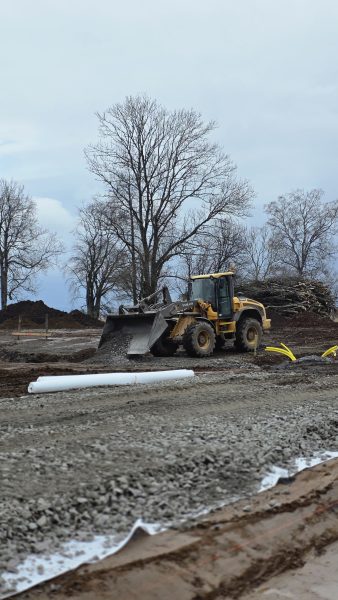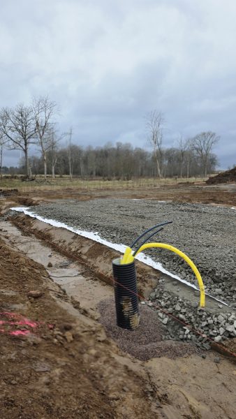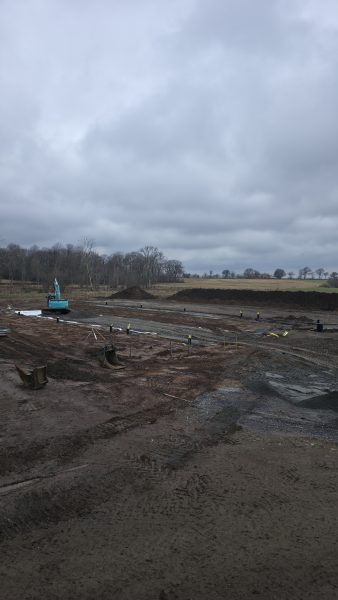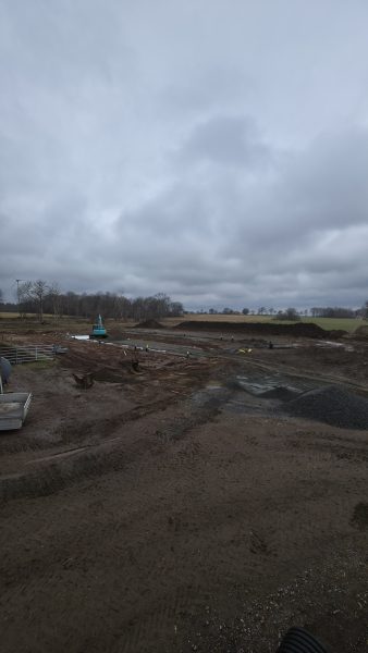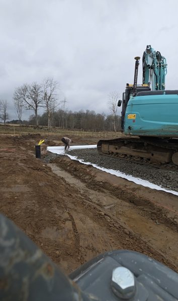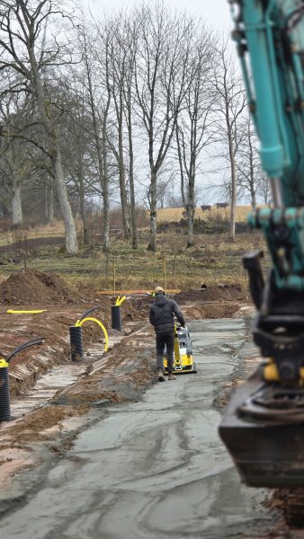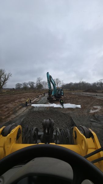 Idag börjar vi lägga markduk och sen tippar vi grus därpå. Lastbil med släp kommer i snitt en gång i timmen med grus.