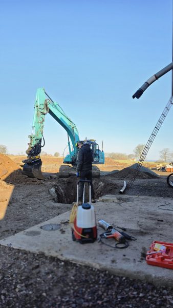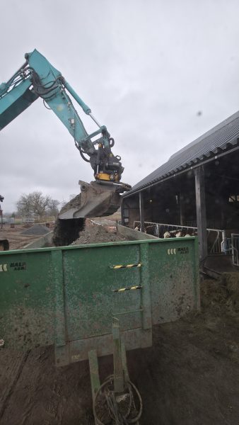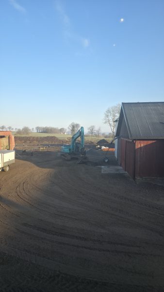 Idag startade John och grävaren dagen utanför torken. För där har vi en brunn som vi har en dränkbar pump i. Men nu ska det bli ett minne blott. För idag grävs gårdsplanen upp för att lägga ner rör som leder bort vattnet.