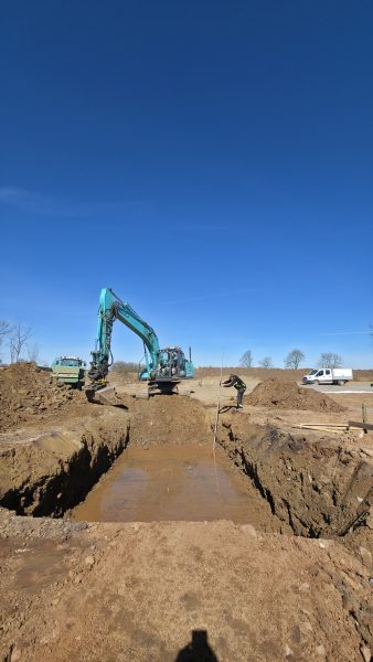 Ja, vad har hänt idag då egentligen? Grävaren har slutfört där dagvattnet ska rinna ut tillsammans med John.