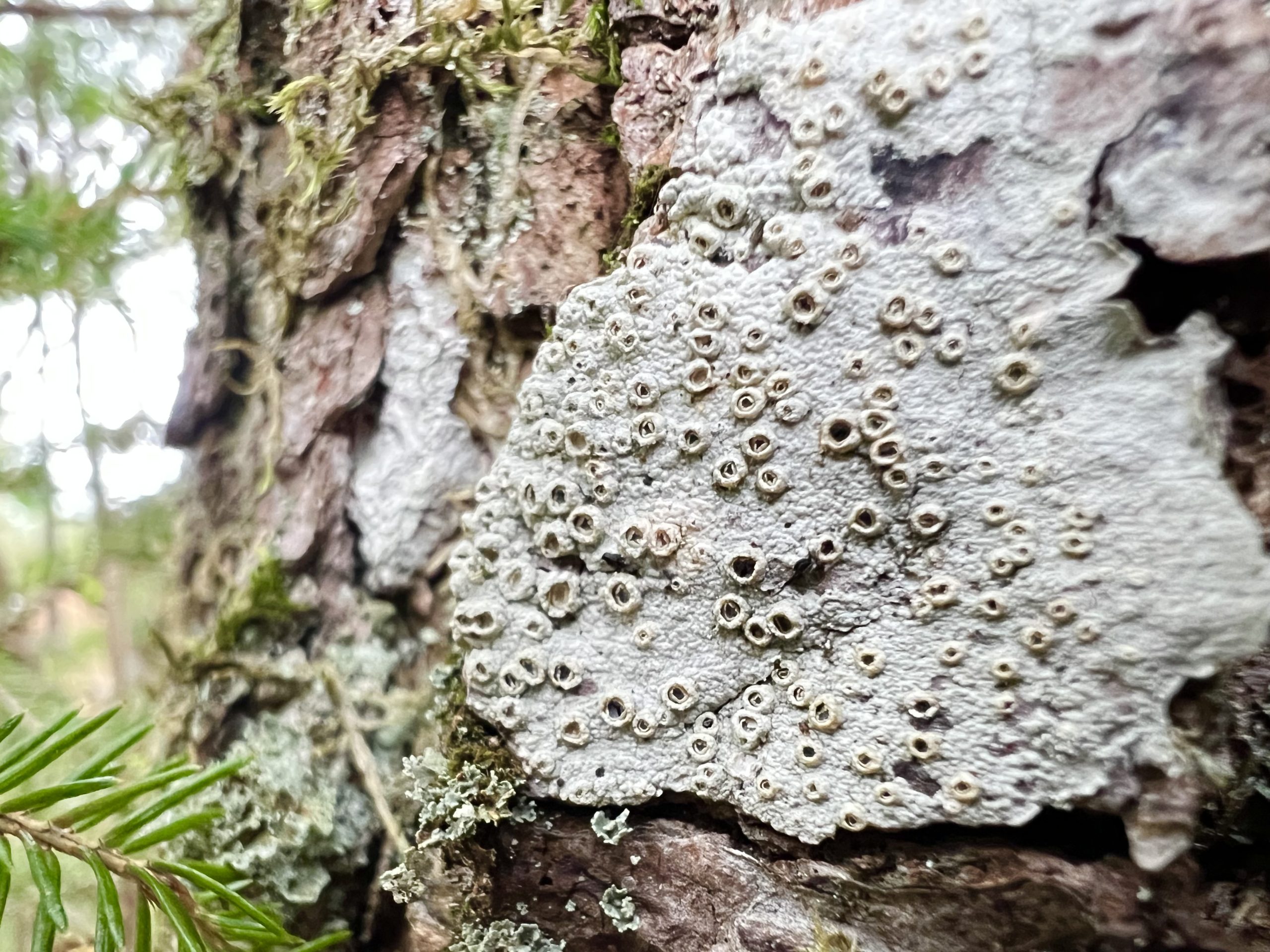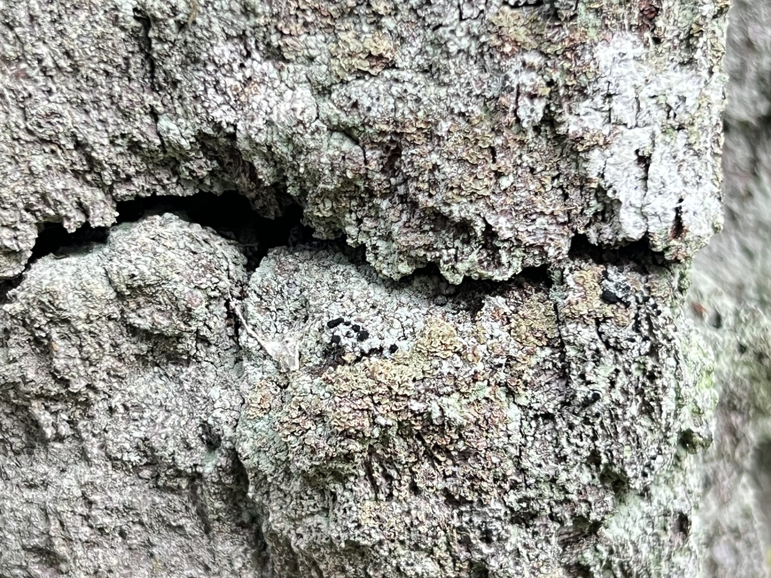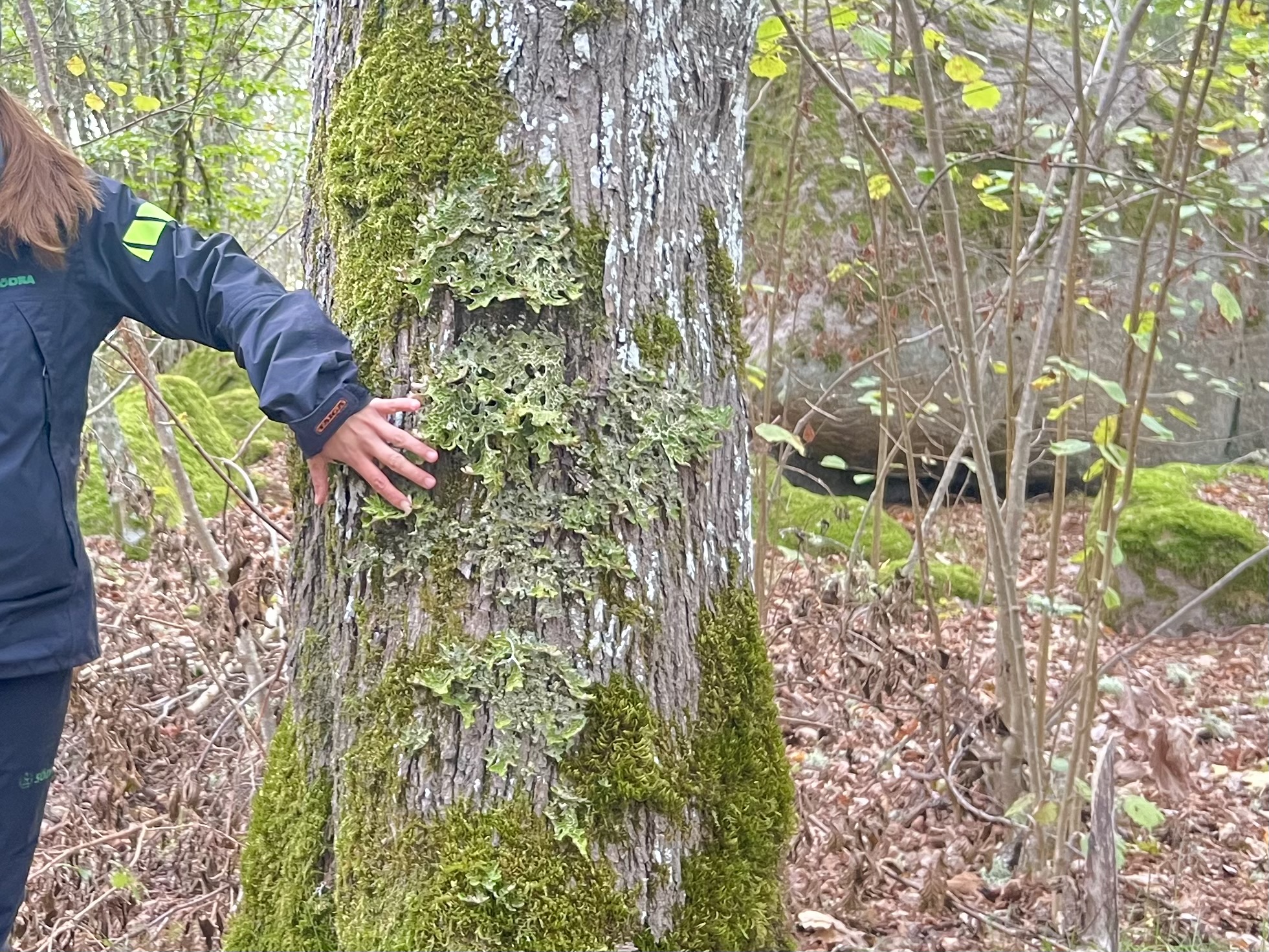 På en gammal björks pansarbark hittade vi Sotlav ”Lakrits semlor” som är en signalart med högt värde. Den behöver ljus, värme och skorpbark.