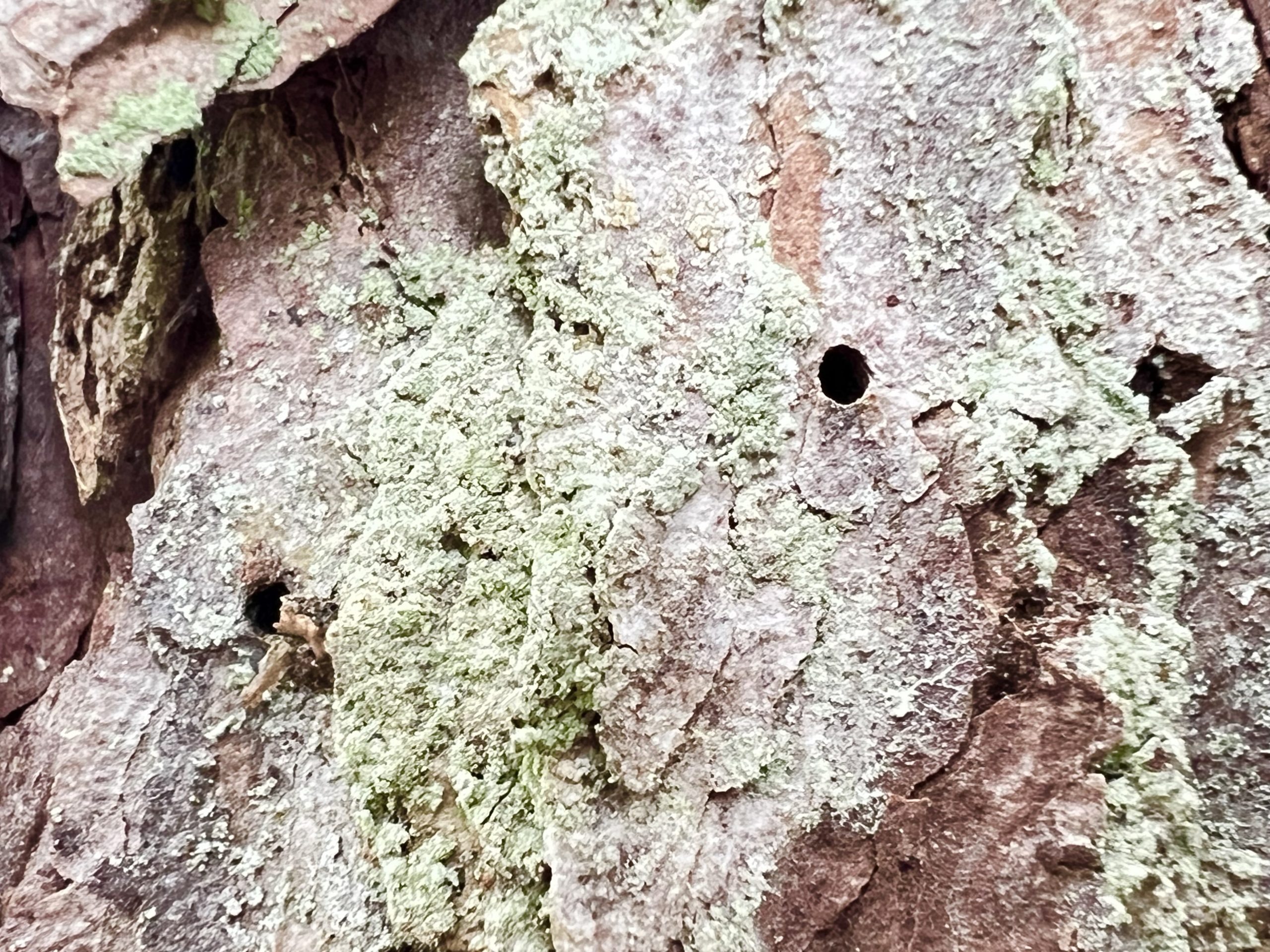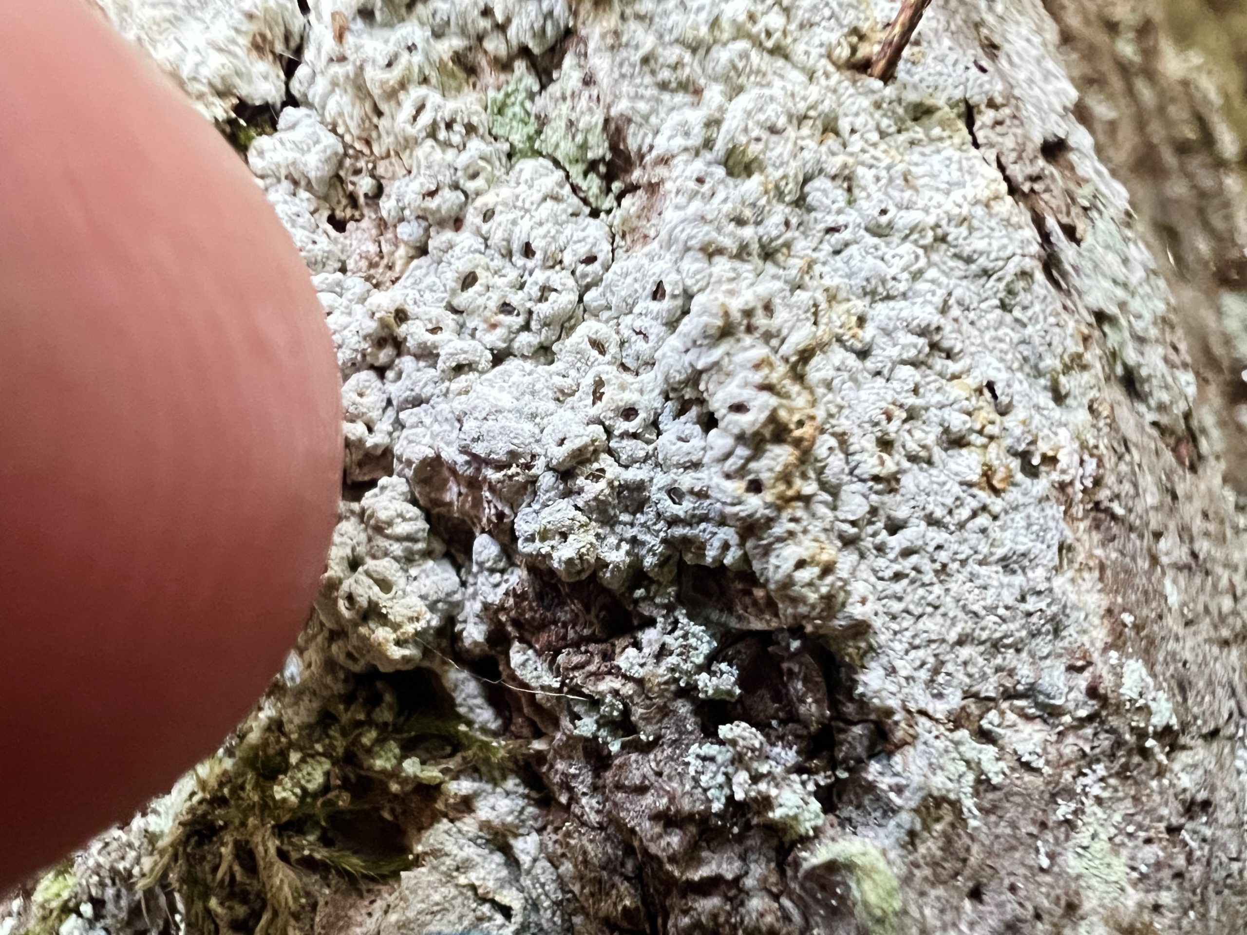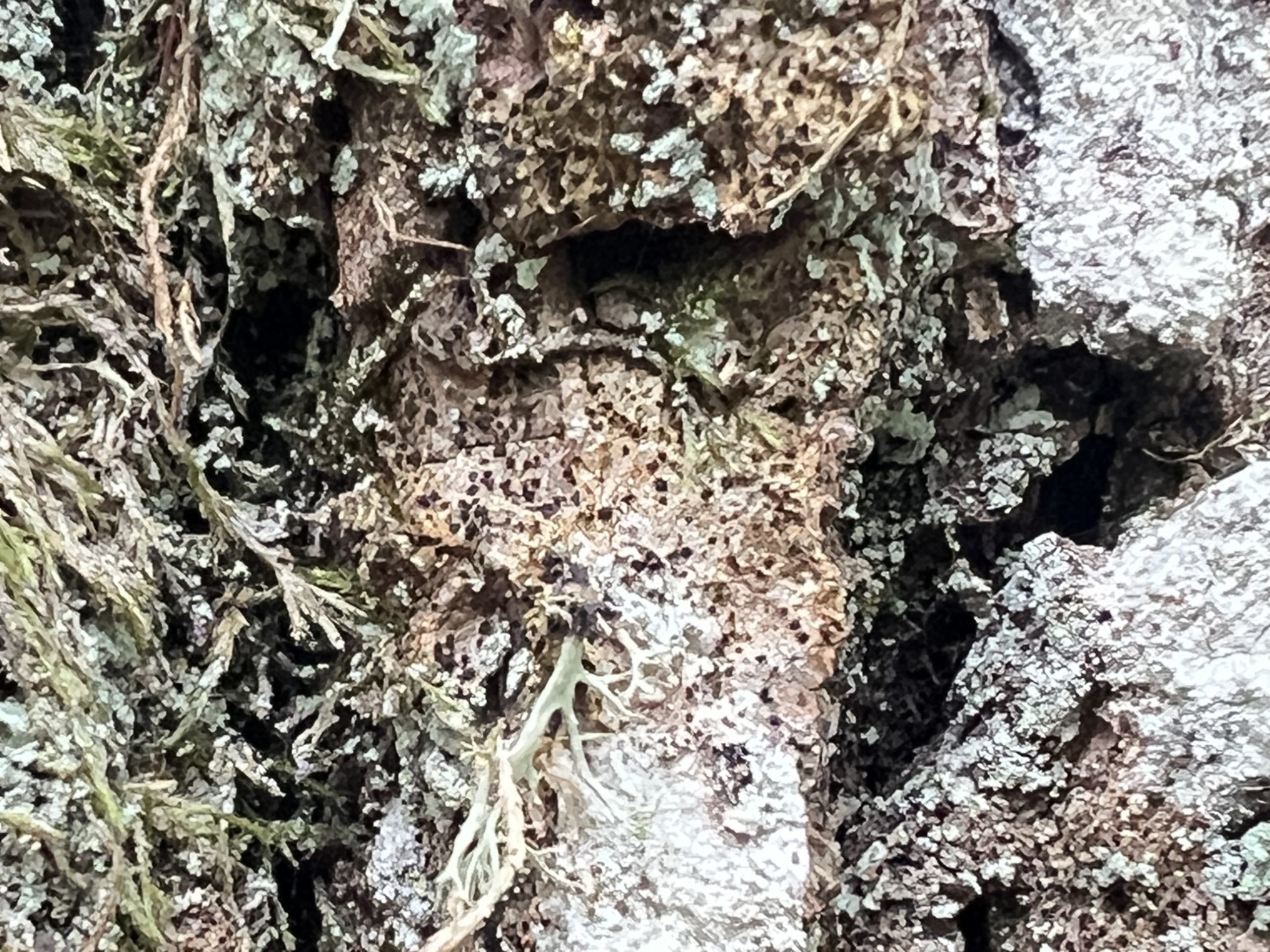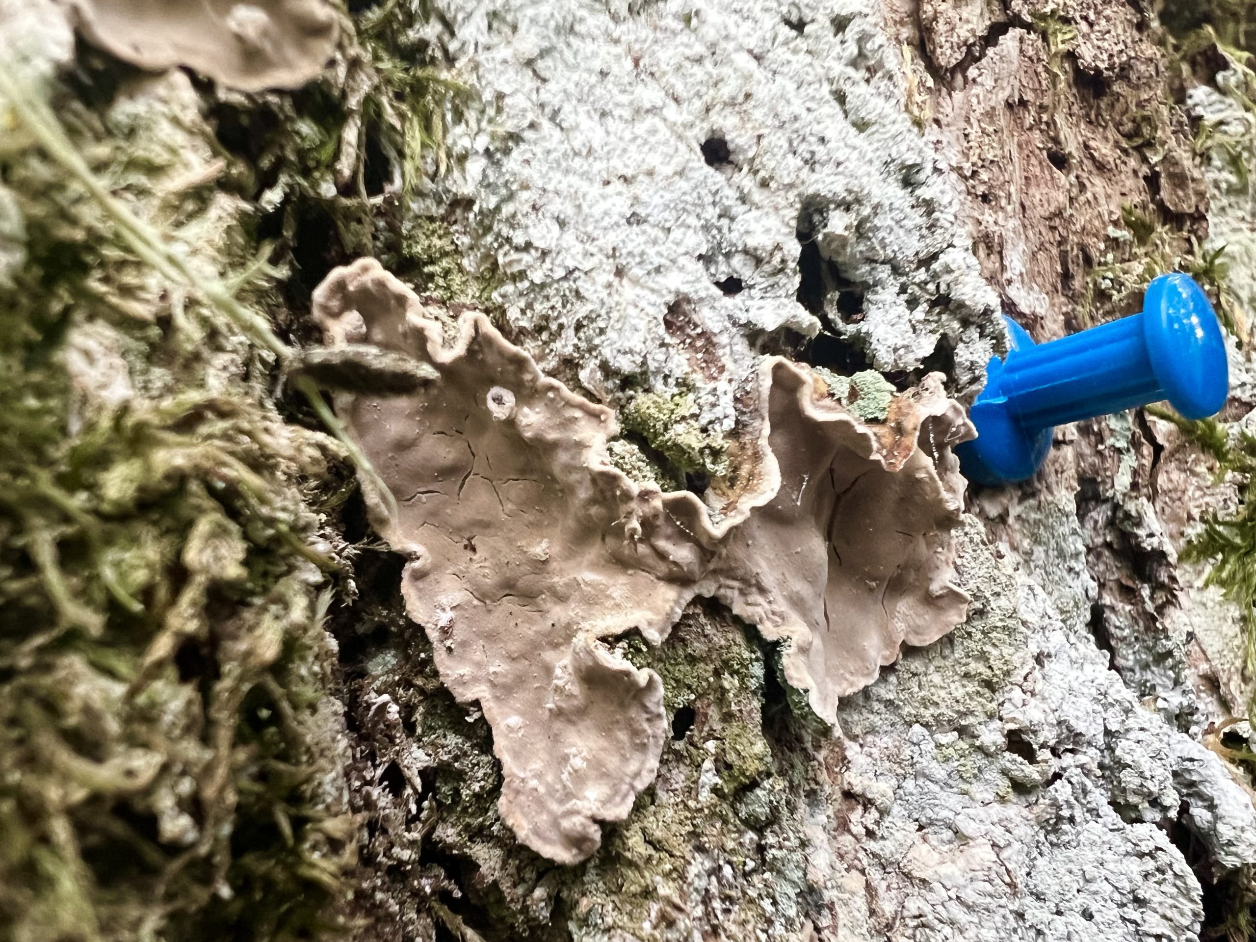 På en gammal björks pansarbark hittade vi Sotlav ”Lakrits semlor” som är en signalart med högt värde. Den behöver ljus, värme och skorpbark.