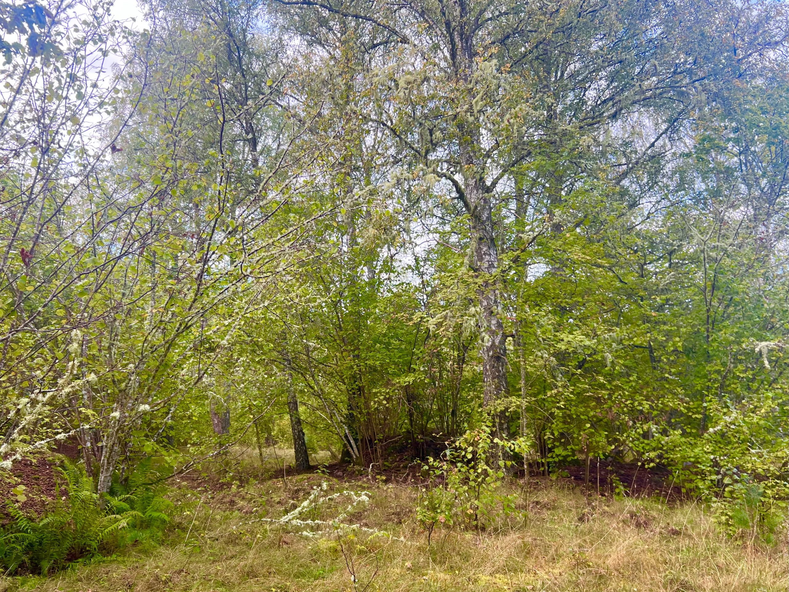Vi möttes först av en ”Kandelaber björk”. Ett ovanligt inslag i kulturlandslapet med hamlade björkar, då de dött ut. Hamlade gamla träd är typiska naturvärdesträd. Ett historiskt inslag i en igenväxt hagmark, med bevis om brukande och svåra tider när man var tvungen att hamla träd för att få mat till djuren. Örter och ängsväxter som stor blåklocka vittnar om gammal ängsmark och skogsbete.