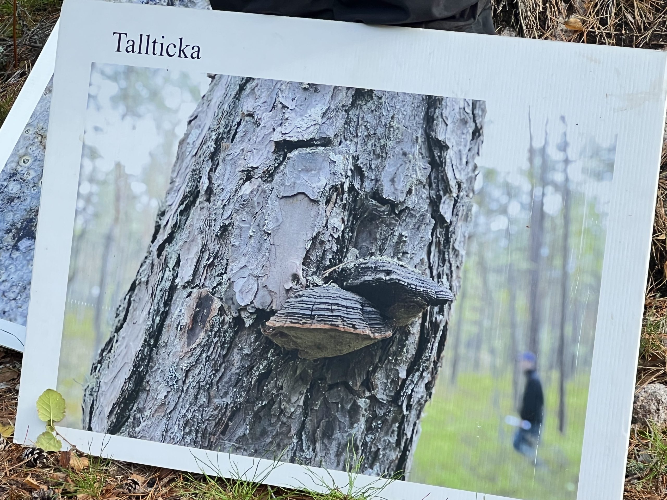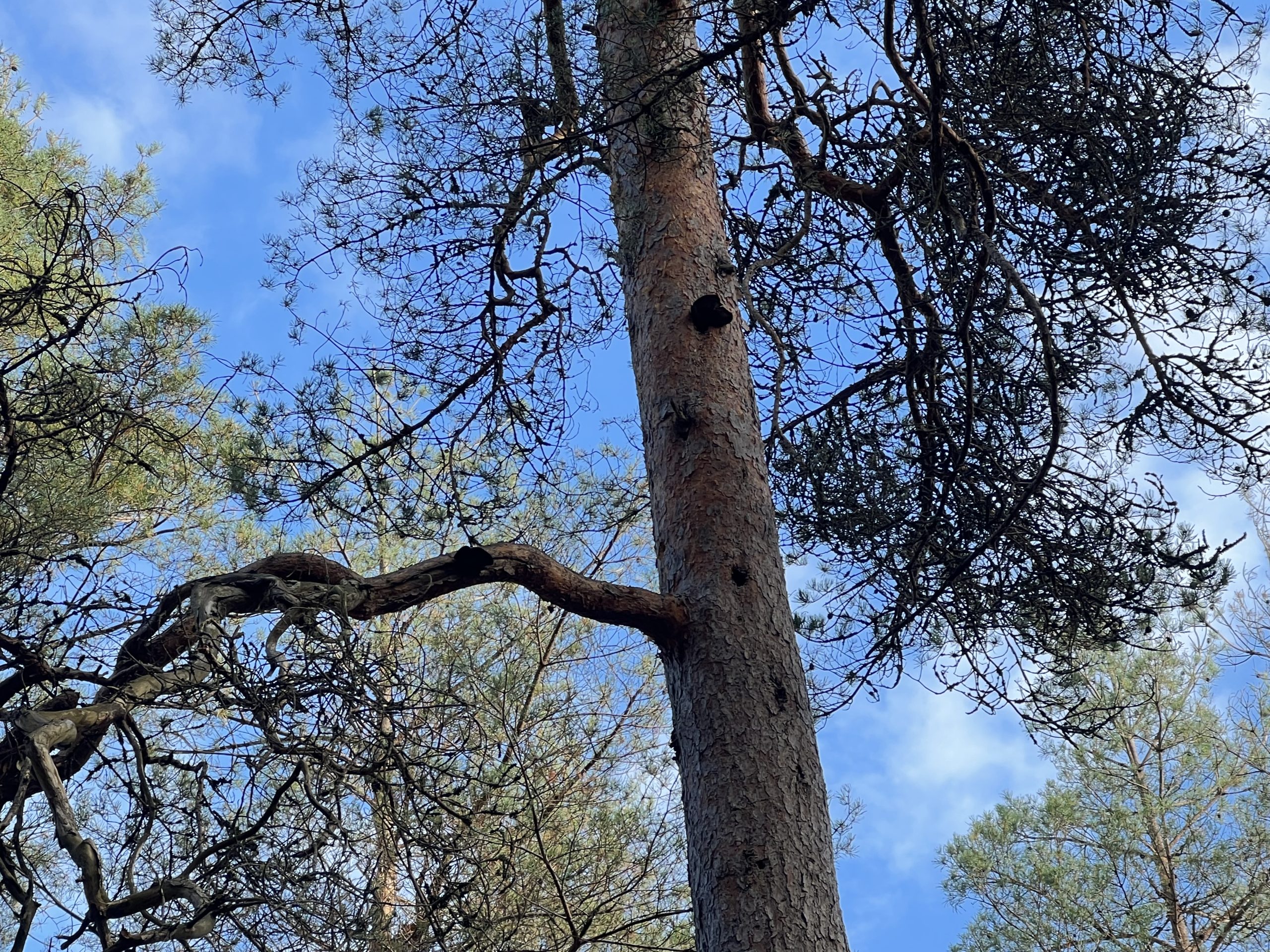 Även här hade de testat naturvårdsbränningar. Där hittade vi en nära hotad parasit högt upp på stammen. En Tallticka.