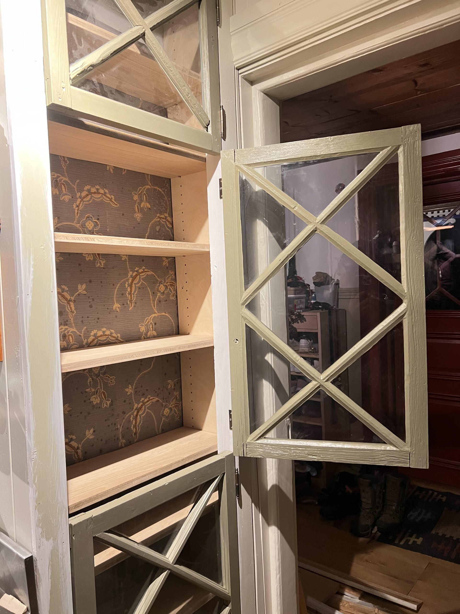 Sen har det blivit en hel del spel. Här är det ”Ticket to ride” och så montering av vitrinskåp i köket. Tapeten i skåpet fanns eller sattes upp när gammelfarmor och farfar flyttade hit. Så den är mer än 100 år gammal och hittades när vi flyttade köket. Fönstren kommer från gamla ladugården.