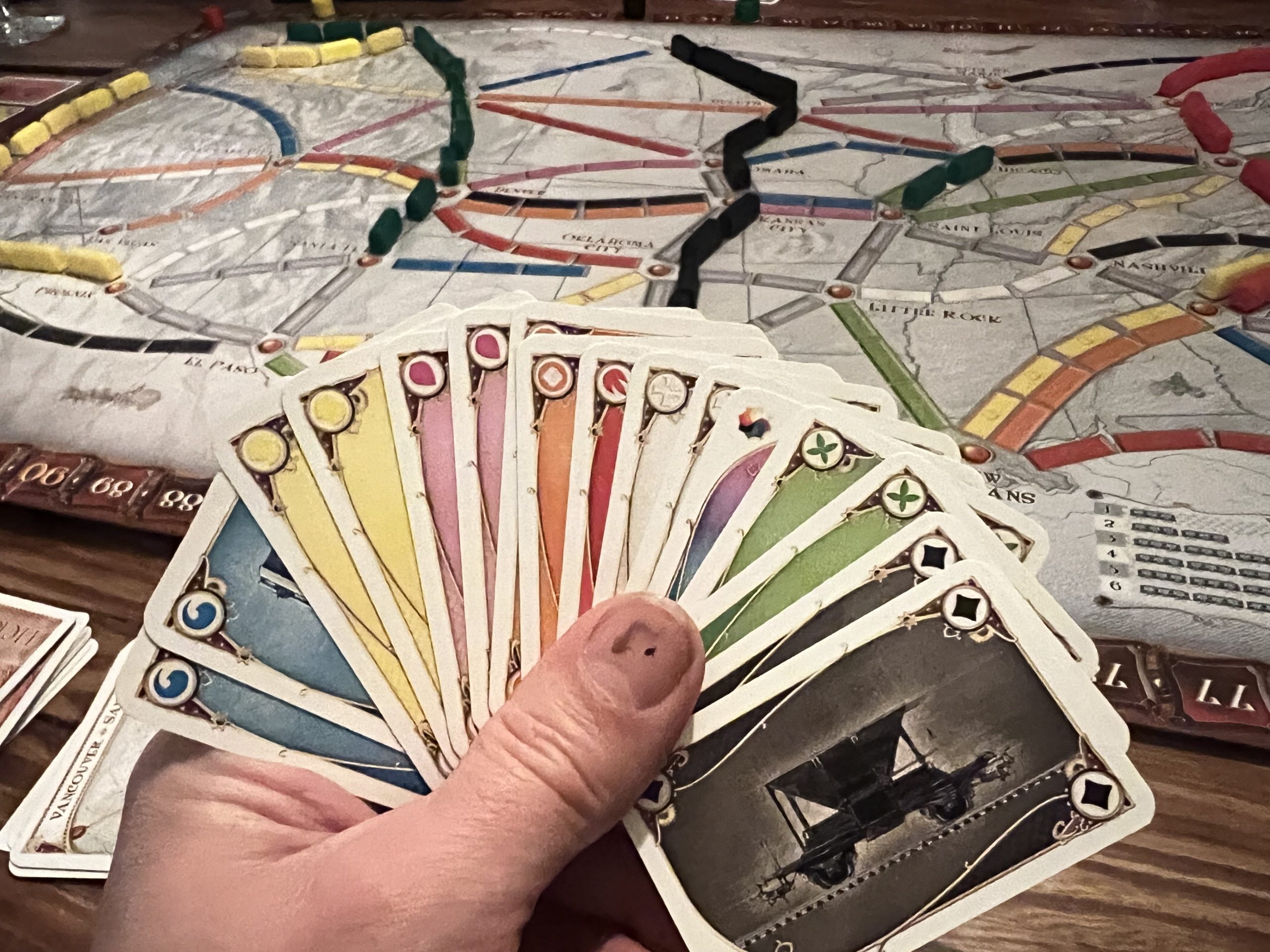 Sen har det blivit en hel del spel. Här är det ”Ticket to ride” och så montering av vitrinskåp i köket. Tapeten i skåpet fanns eller sattes upp när gammelfarmor och farfar flyttade hit. Så den är mer än 100 år gammal och hittades när vi flyttade köket. Fönstren kommer från gamla ladugården.