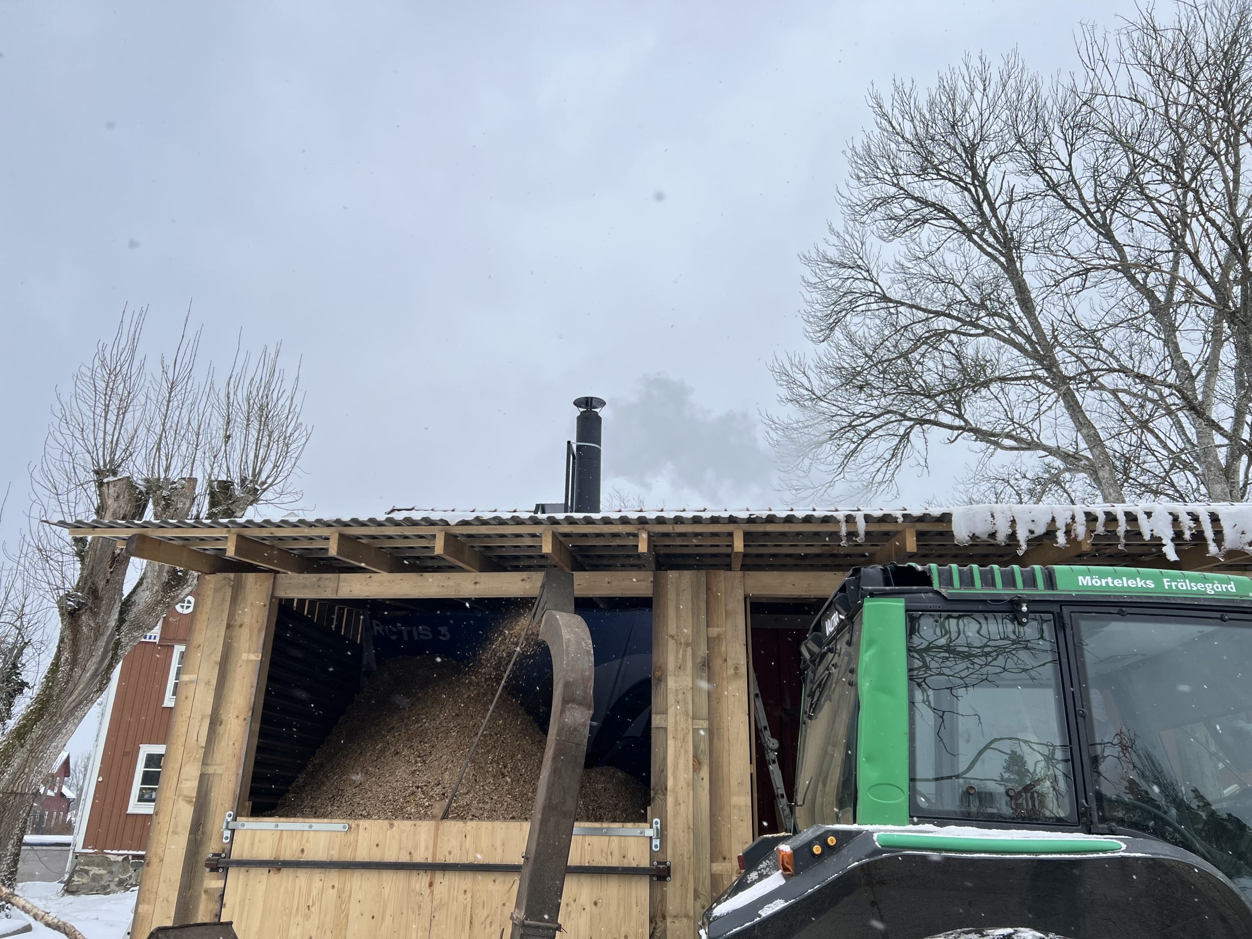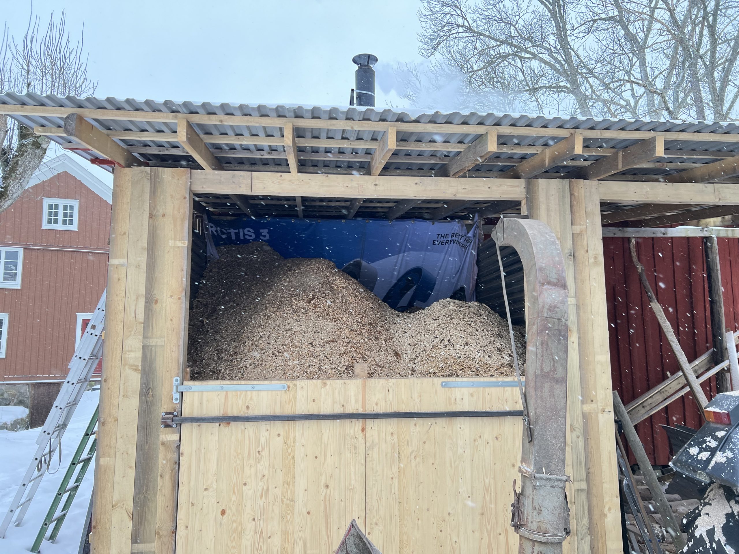 Även om anläggningen är nästintill helt självgående så behöver, eller vi har snarare valt, att flisa själva. Ja flisning behöver göras, men annars är den nya flisanläggningen helt självgående. Lyxigt!