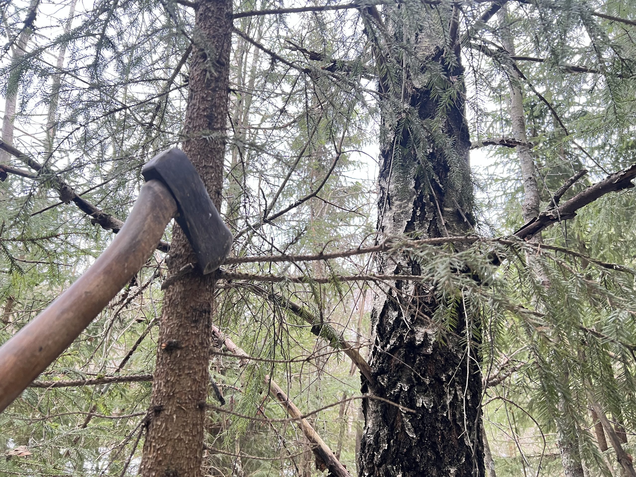 Skönt att kunna göra nytta och rasta hund samtidigt och då underlättar det att jobba med yxan istället för med motorsågen. Jag når även betydligt högre upp än vad som är ok att jobba med motorsågen.