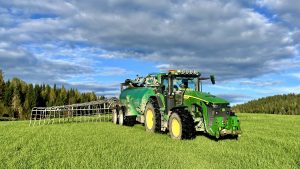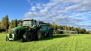 Det blev ingen flytgödselkörming efter första skörden i år så brunnen bara fylldes på och fylldes på. Vi har egentligen inget riktigt flytgödselsystem men vi leder lakvatten från fastgödselplattorna till brunnen och tippar den lösaste skiten från skrapgångarna där. Sedan regnar det ju också och om man inte tar ur något blir det ganska fullt till slut.