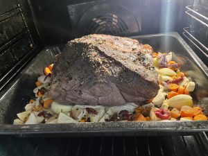 På med köttbiten bara och allt får gå ett tag tills grönsakerna blir lagom rostade. Sedan ska jag koka hela härligheten med vin och kryddor. Länge, länge tills högreven bara faller isär.