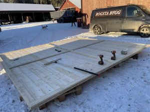 Två fina träportar har snickrats och alldeles innan helgen hängdes de upp i sina skenor. Bra planerat eftersom det var dags för inspektion idag, måndag.