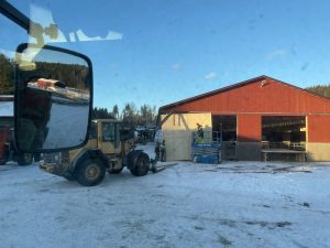 När det ska gå snabbt bränner man av ett par bilder genom rutan på hjullastaren. Inte så skarpa men vill man fånga upphängningen av portar får man rappa på.
