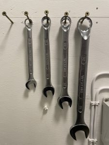 Vårt förslag till lösning är att ha blocknycklar i rätt storlek hängande alldeles i närheten. Så att vi, om vi mot förmodan någon gång skulle behöva få ut djuren via foderbordet, enkelt kan lossa på två bultar och vika undan inredningen.