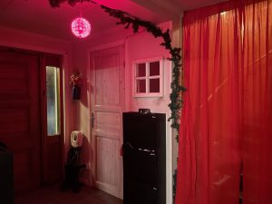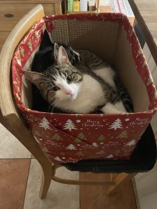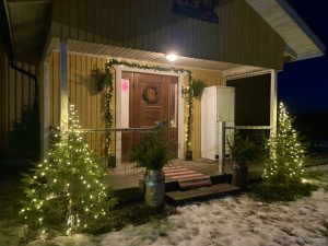 Jag tänker att man måste jobba med både det stora och det lilla. Jag drog till skogs och högg en gran som ska in i morgon, band ihop en dörrkrans och satte upp ljusslingor. Men jag pyntade även klatternas favoritkartong med ett lager julpapper och ställde in en liten tomte i badrummet.