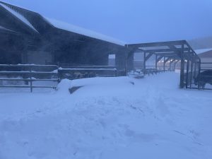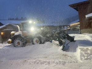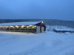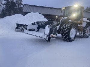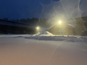 Danne skottade vägen tidigt i morse så djurtransportören som sovit i bilen skulle kunna lämna gården. Nu håller han på för fullt igen så vi kan ta oss fram med övriga maskiner och på egna ben.