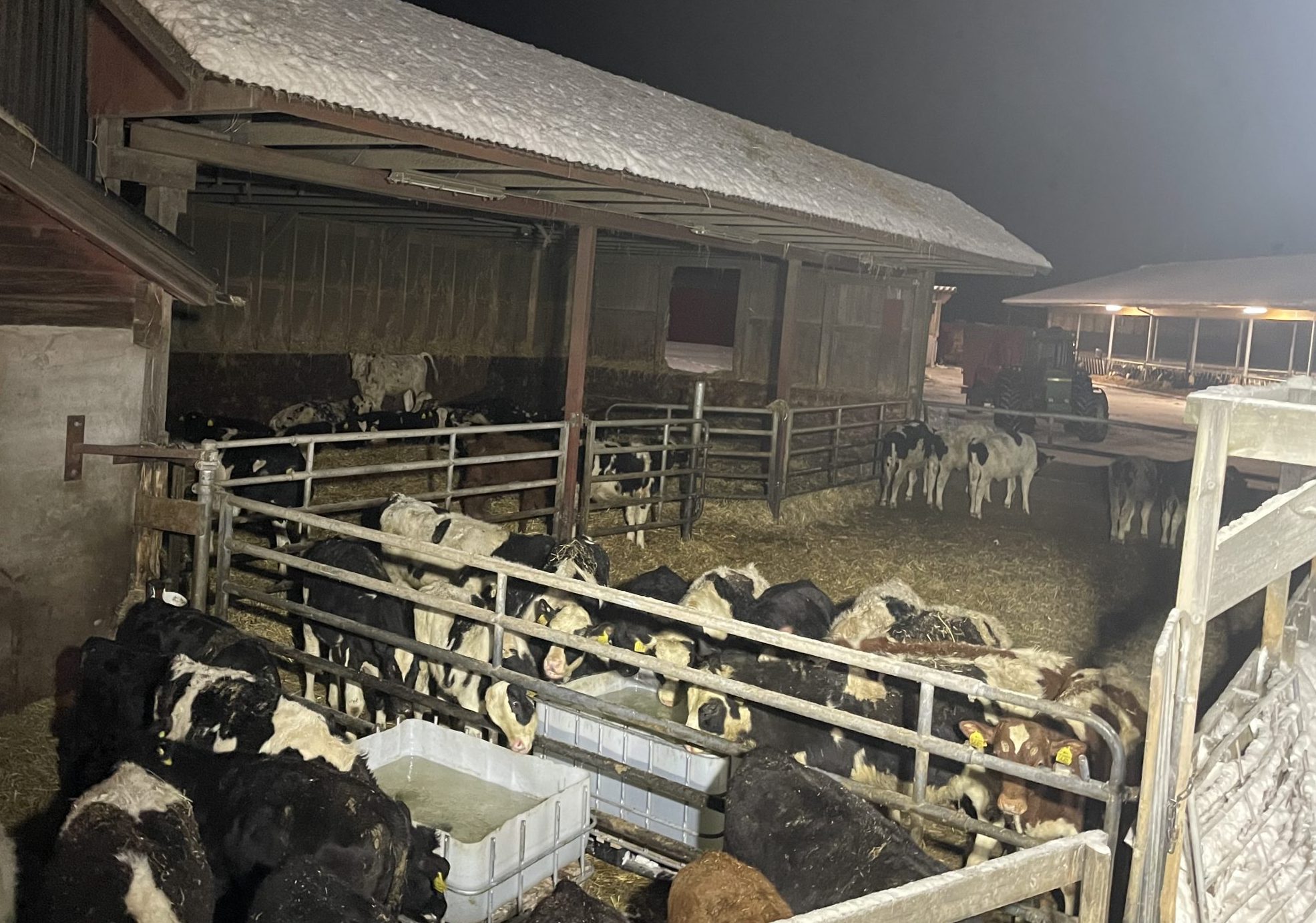 Några av vattenkopparna fryser till under nätterna när temperaturen går ner och inga djur är vakna och dricker. Är det bara i själva koppen räcker det med att hälla i lite varmvatten och vänta en stund så släpper det. Dock inte överallt. Hos två av djurgrupperna verkar något ha fryst ihop längre ner i ledningen och de senaste dygnen har inte en droppe vatten kommit. Ett gammalt, hederligt bondebekymmer. Djur utan vatten när det är svinkallt ute. Jippie…