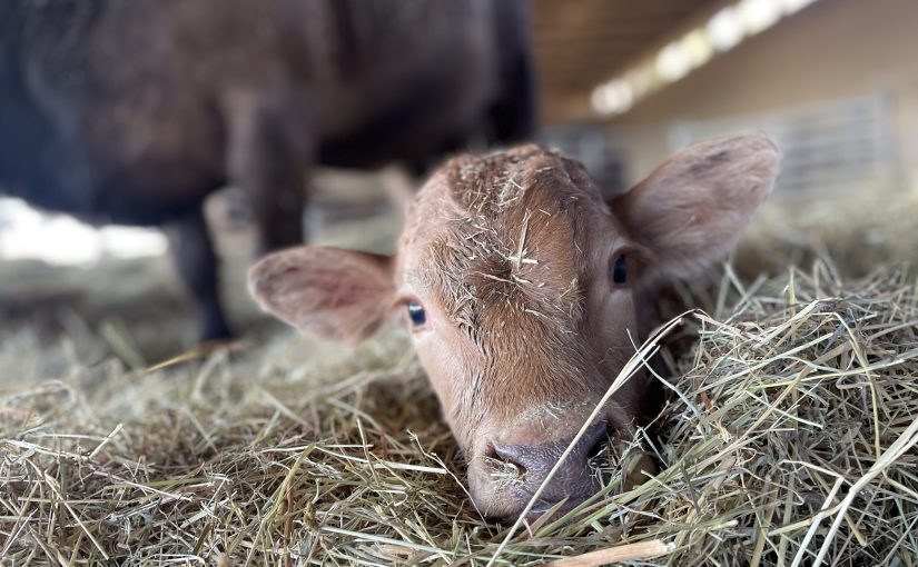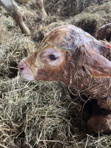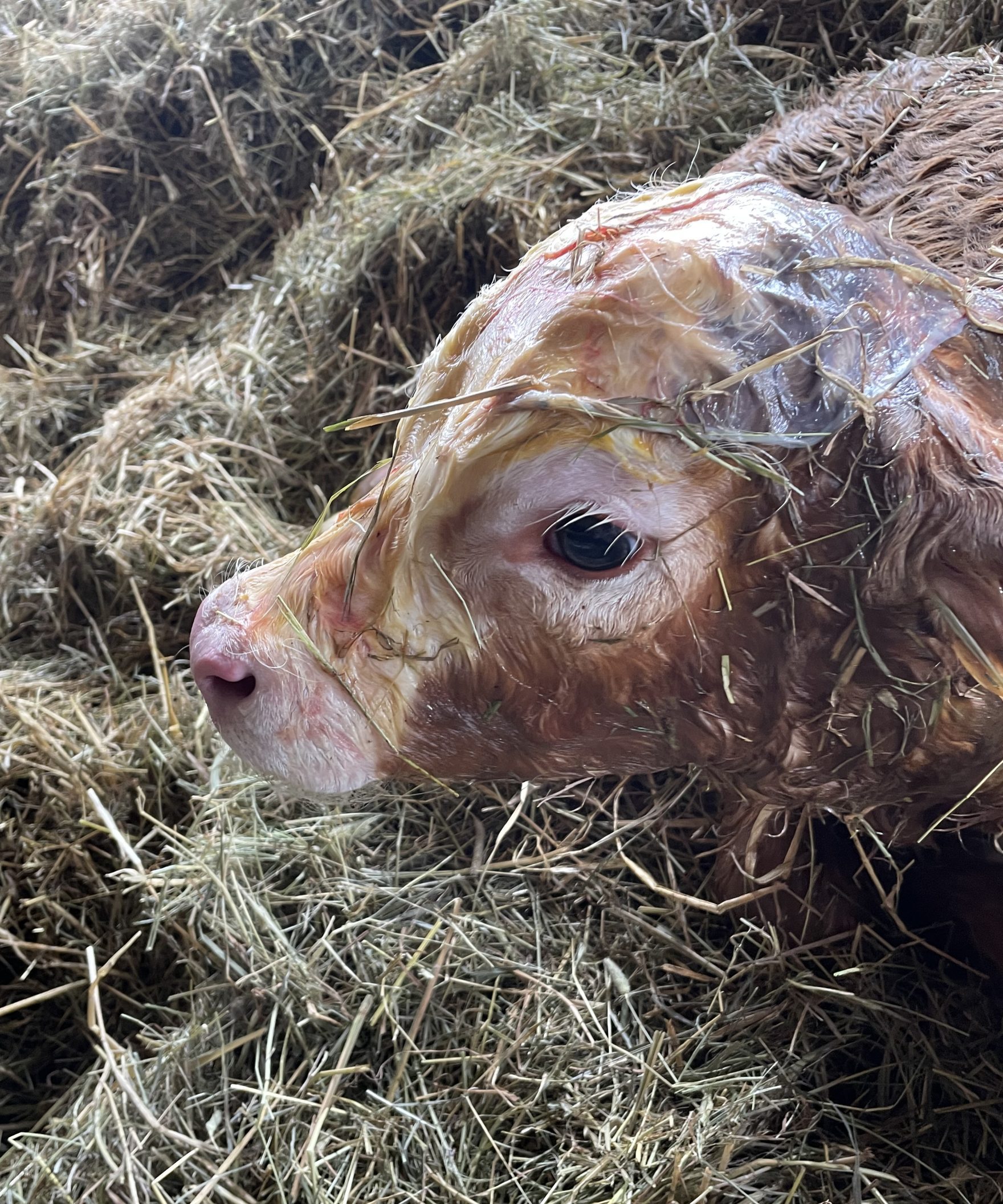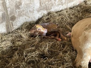 Mulen och underkäken var lite uppsvällda först och benen och klövarna är inte riktigt i proportion till resten av kroppen. Men han var inte för stor i sin helhet utan låg nog bara lite klämd innan kvigan klev upp och bytte ställning. Då knixade han till sig i rätt läge och kunde komma ut utan problem.