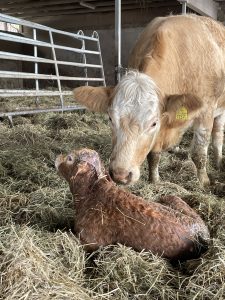 Den här kalven är son till en av våra egna kvigor och vi var lite bekymrade när han skulle ut. Jättestora ben och klövar samt en satsad mule hängde ut medan hon kämpade. Bara att hämta utrustning och göra sig beredd att hjälpa till.
